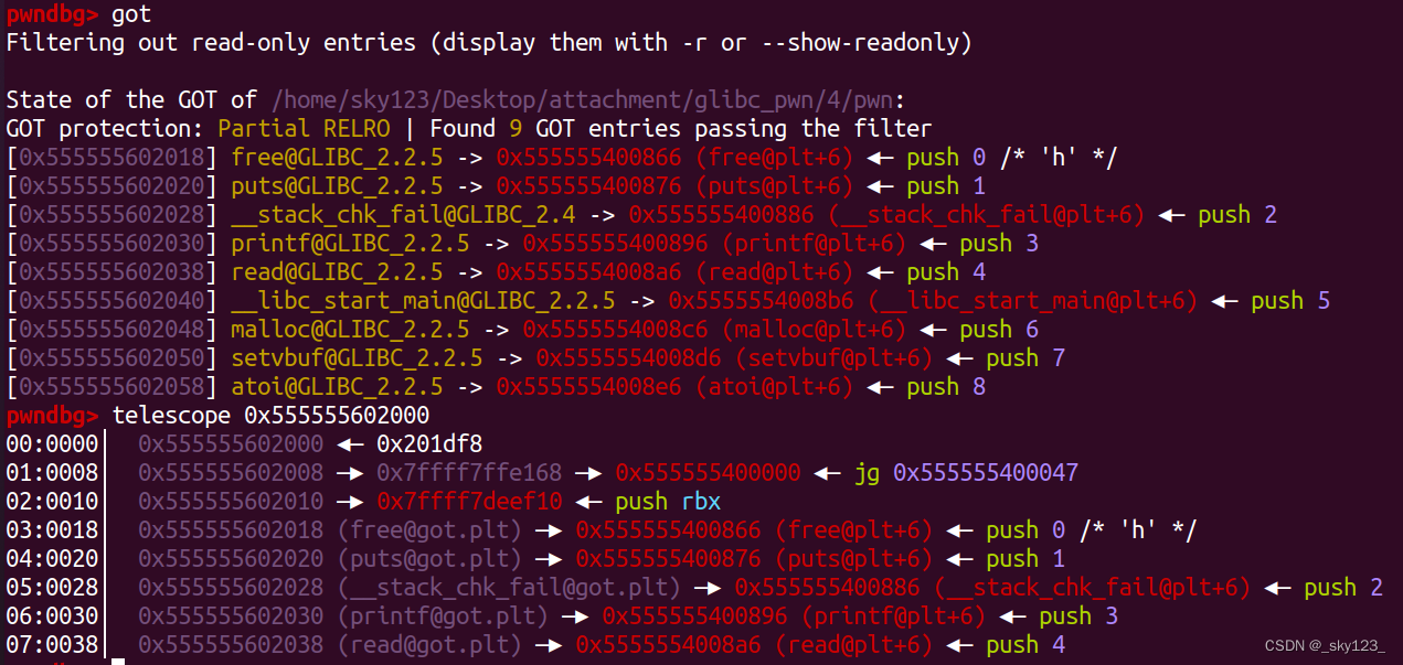 init.array、fini.array、got.plt均可读可写。 - 为 PARTIAL RELRO 的时候,