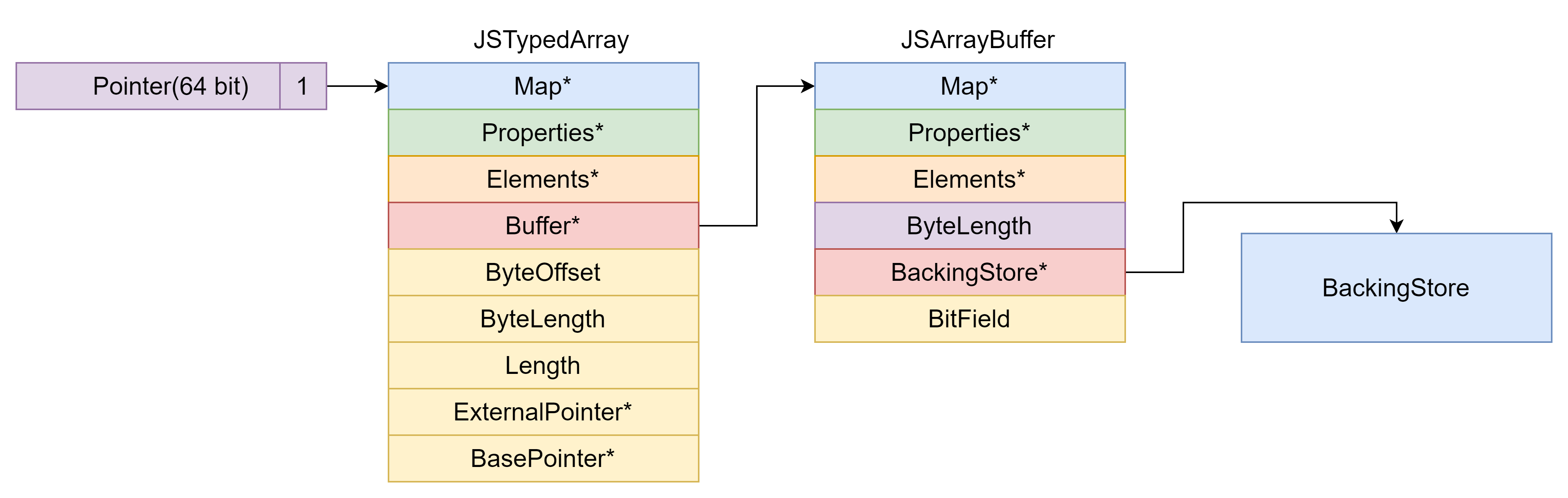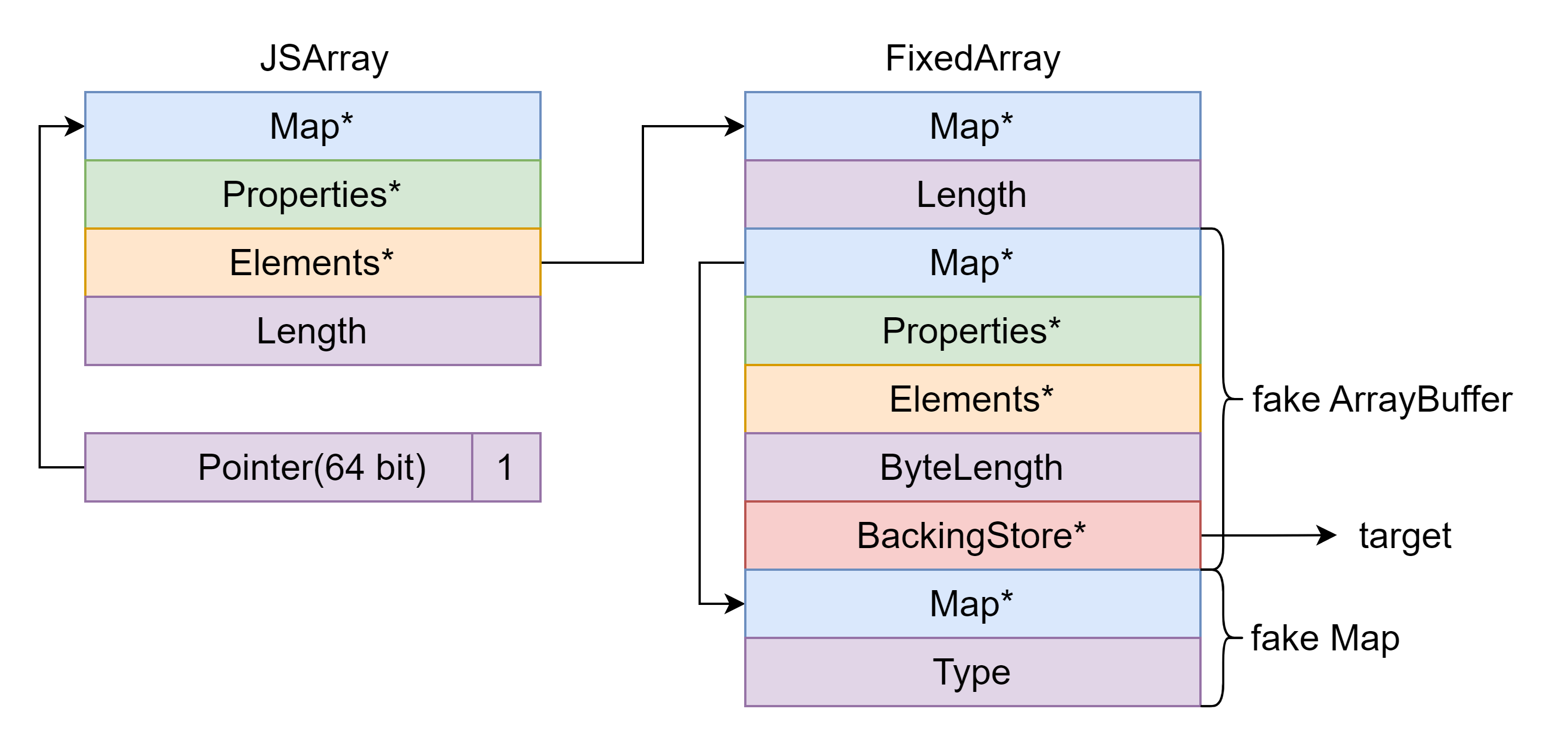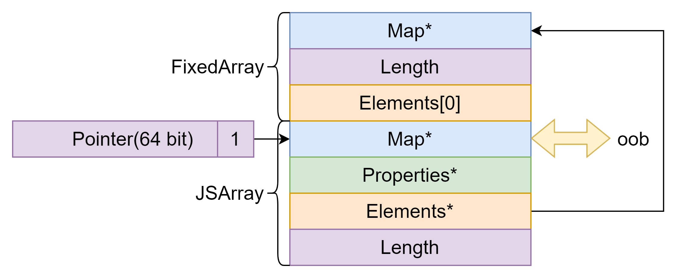 Hidden Class (Map) Hidden Class 也被称作 Object Map,简称 Map。位于 V8 Object 的第一个 8 字节。 任何由 v8 gc 管理的 Js Object ,它的前 8 个字节(或者在 32 位上是前四个字节)都是⼀个指向 Map 的指针。Map 中比较重要的字段是一个指向 DescriptorArray 的指针,里面包含有关name properties的信息,例如属性名和存储属性值的位置。 具有相同 Map 的两个 JS object ,就代表具有相同的类型(即具有以相同顺序命名的相同属性),比较 Map 的地址即可确定类型是否⼀致,同理,替换掉 Map 就可以进行类型混淆。