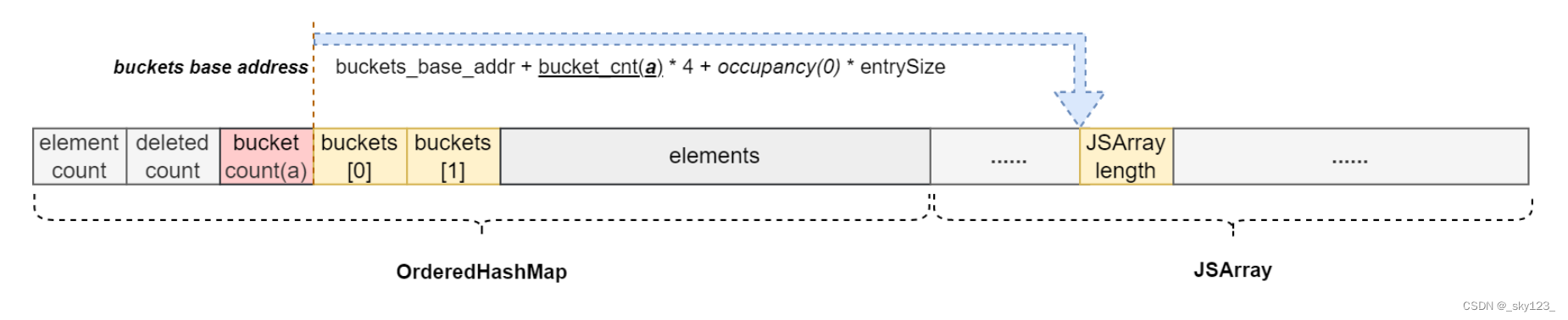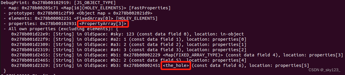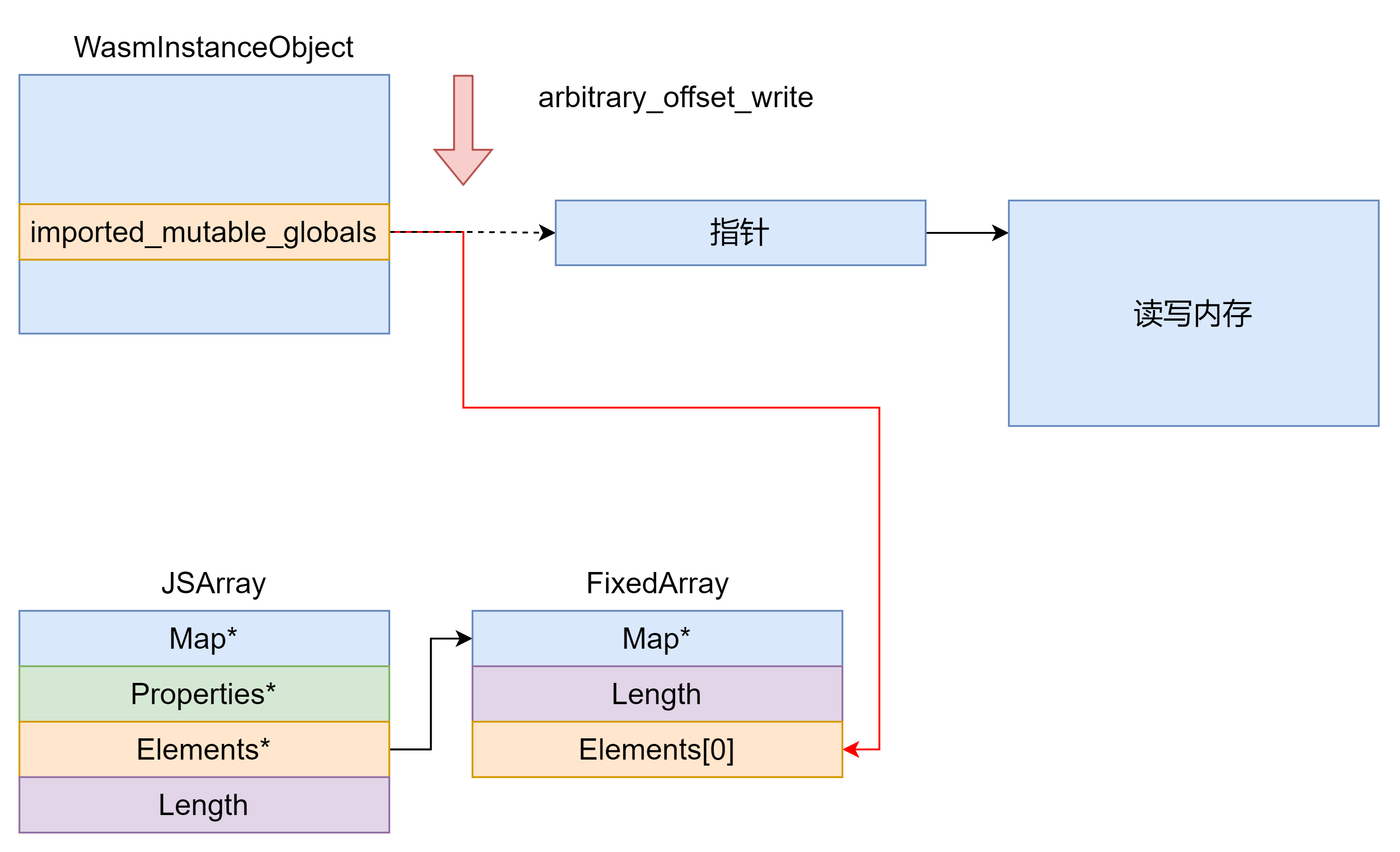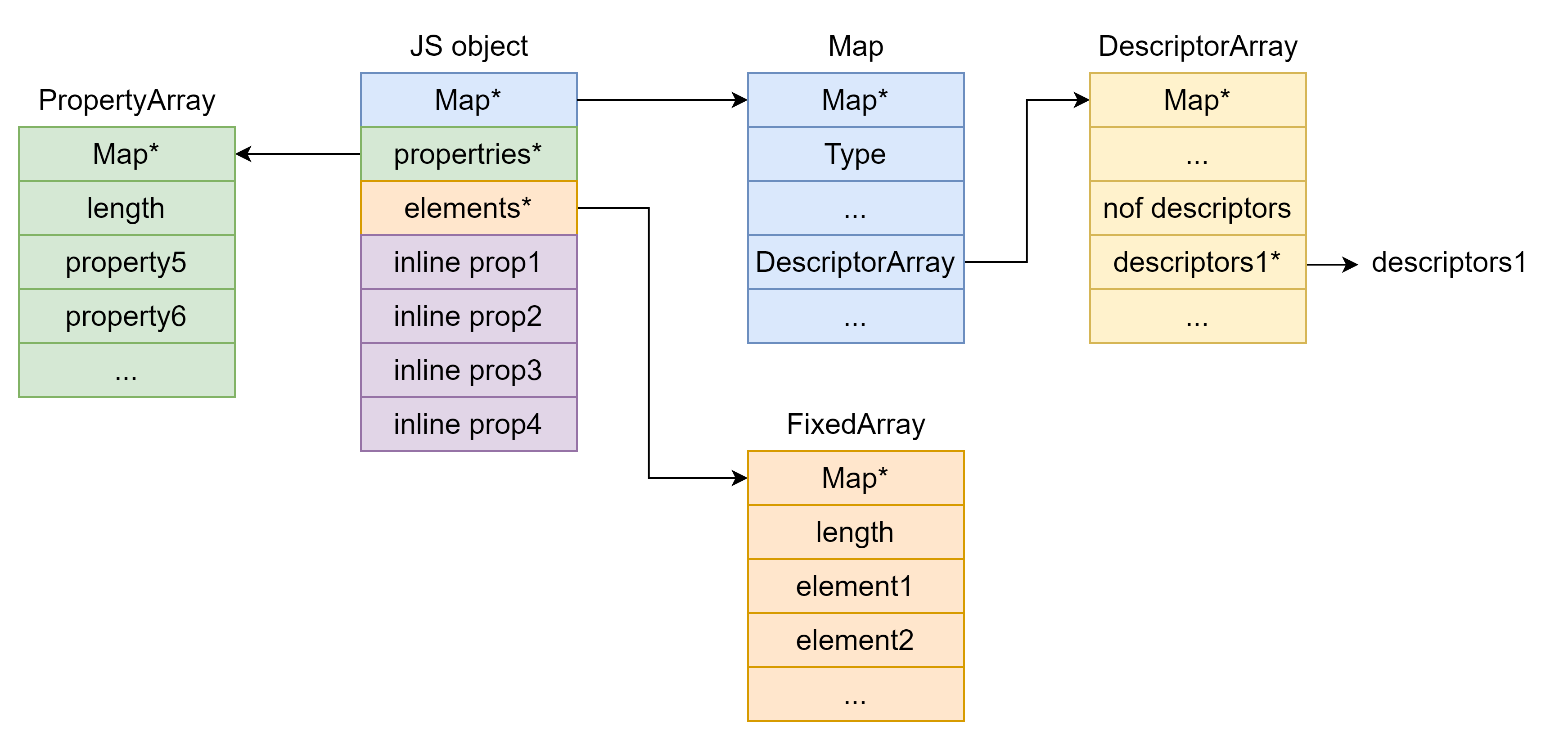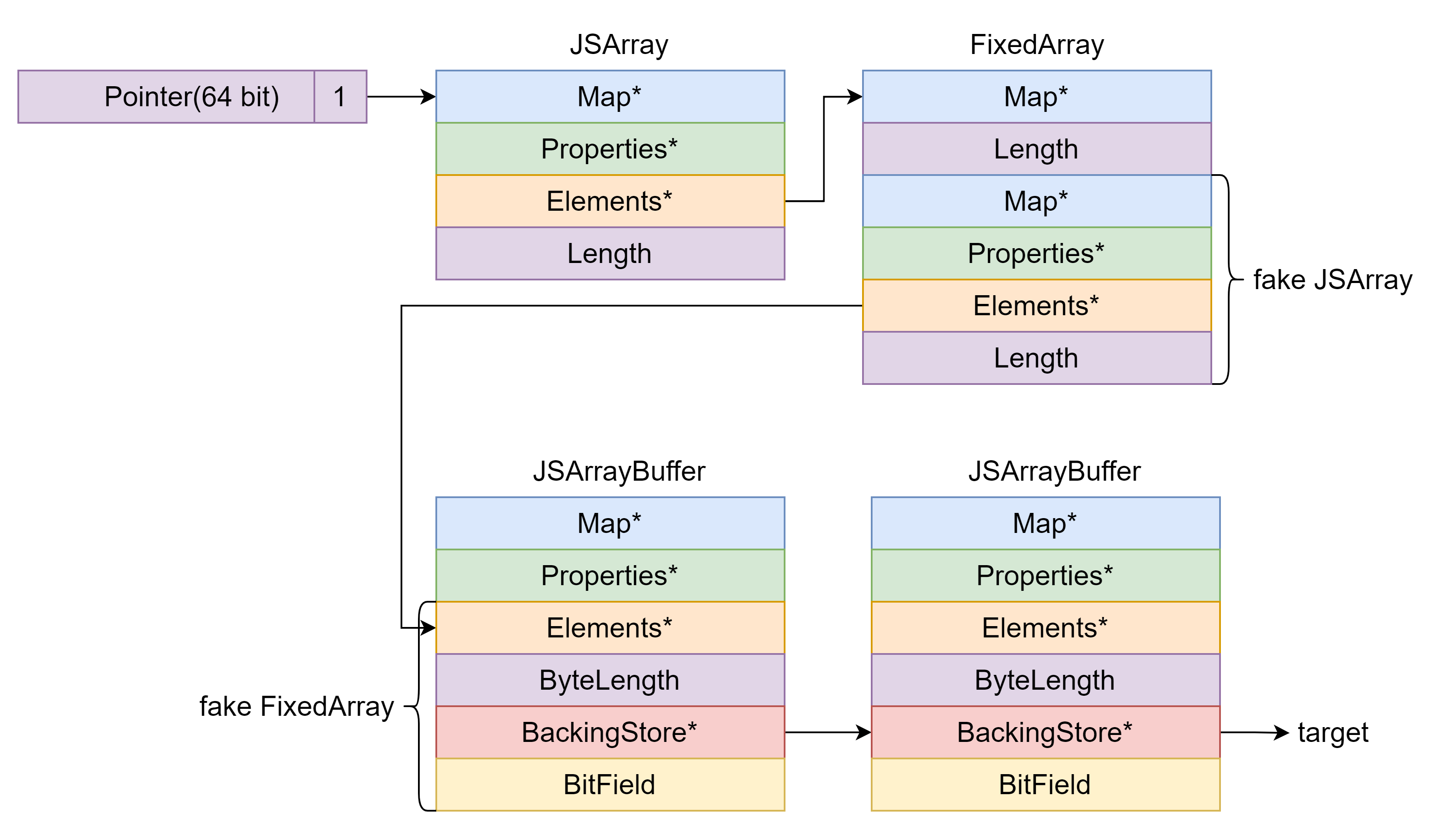 Hidden Class (Map) Hidden Class 也被称作 Object Map,简称 Map。位于 V8 Object 的第一个 8 字节。 任何由 v8 gc 管理的 Js Object ,它的前 8 个字节(或者在 32 位上是前四个字节)都是⼀个指向 Map 的指针。Map 中比较重要的字段是一个指向 DescriptorArray 的指针,里面包含有关name properties的信息,例如属性名和存储属性值的位置。 具有相同 Map 的两个 JS object ,就代表具有相同的类型(即具有以相同顺序命名的相同属性),比较 Map 的地址即可确定类型是否⼀致,同理,替换掉 Map 就可以进行类型混淆。