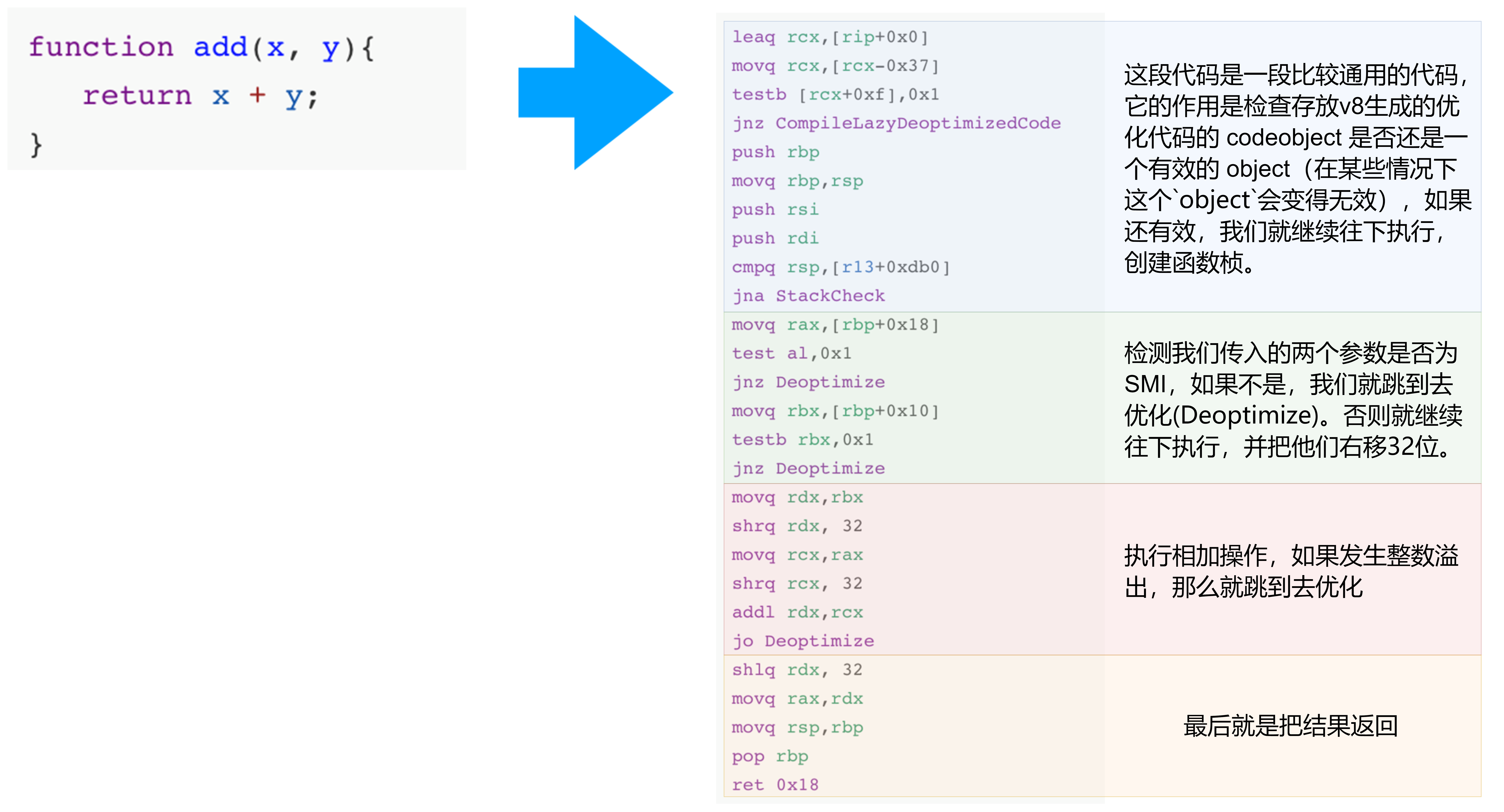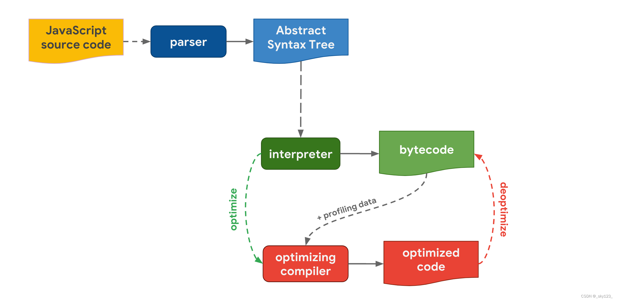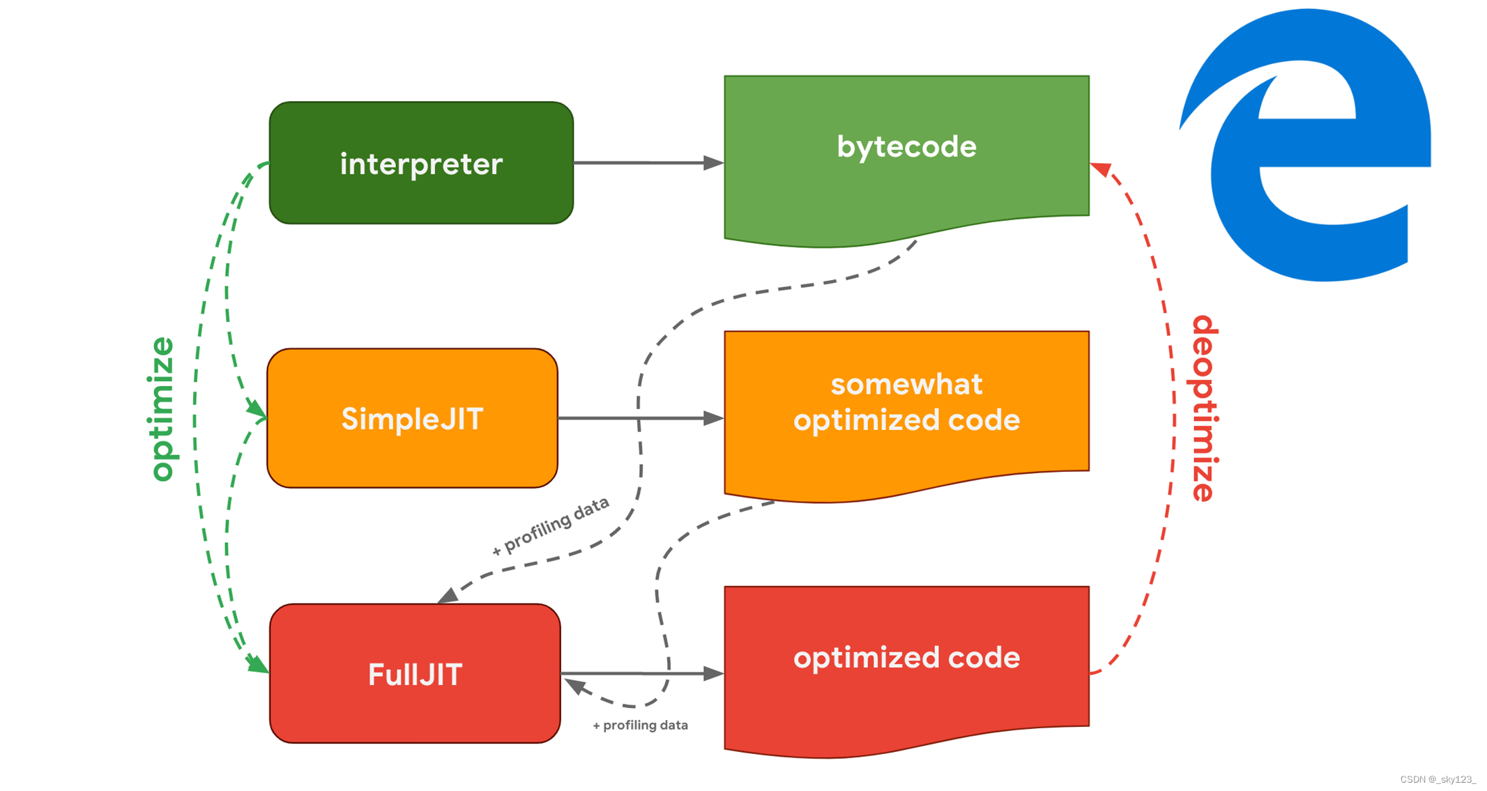 如果收集到了可以被 JIT 优化的代码, 就会被丢到 optmizing compiler 的分支中 让 JIT 做优化,如果后续突然参数类型不⼀样了, 那么就 deoptimize (去优化), 重新执行 bytecode . 然后 bytecode 又可以收集类型.. 然后依次循环。