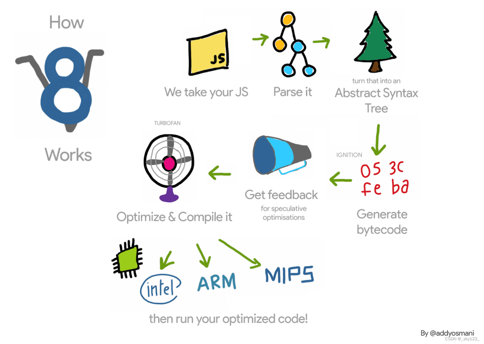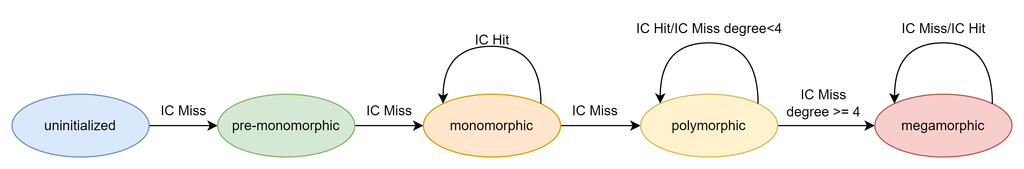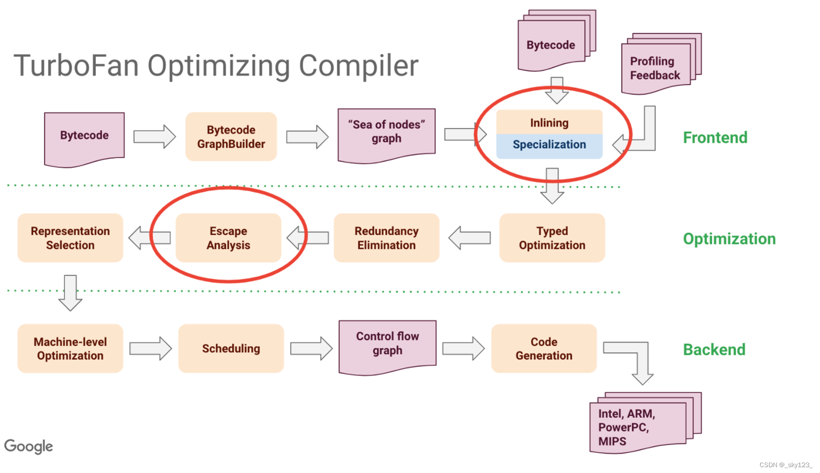 如果收集到了可以被 JIT 优化的代码, 就会被丢到 optmizing compiler 的分支中 让 JIT 做优化,如果后续突然参数类型不⼀样了, 那么就 deoptimize (去优化), 重新执行 bytecode . 然后 bytecode 又可以收集类型.. 然后依次循环。