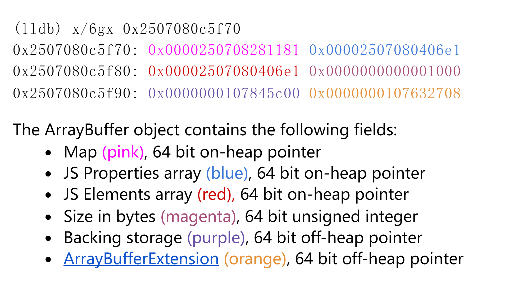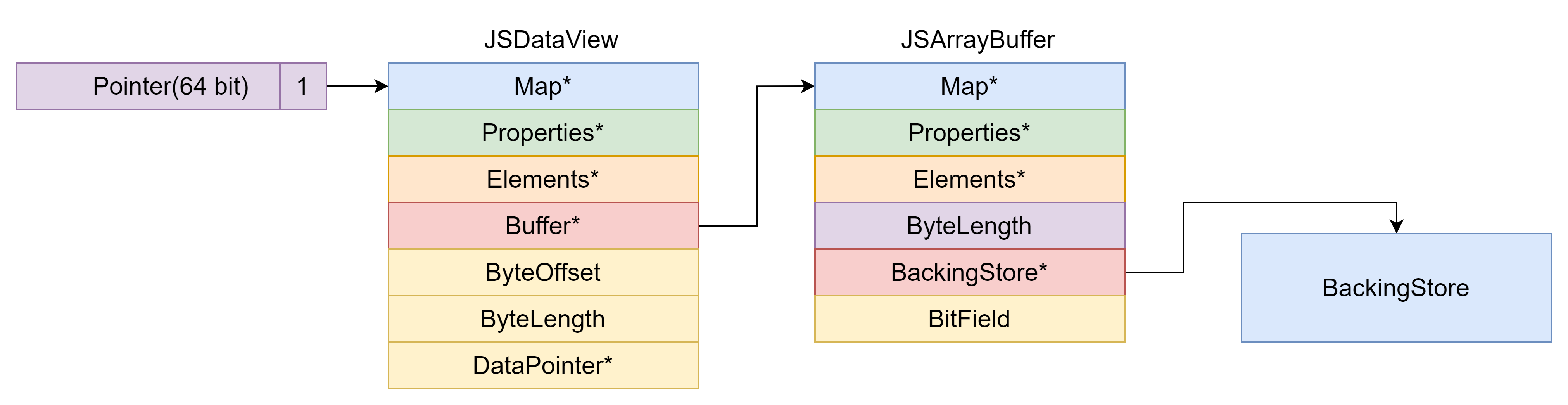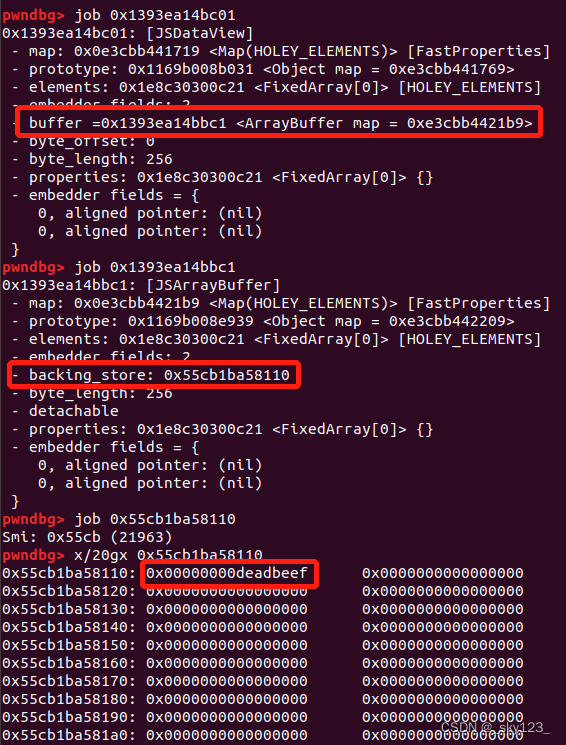 1 2 3 4 5 6 7 var ab = new ArrayBuffer (0x100 );var dv = new DataView (ab);dv.setUint32 (0 , 0xdeadbeef , true ); console .log (dv.getUint16 (2 , true ));%DebugPrint (dv); %SystemBreak ();