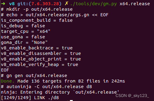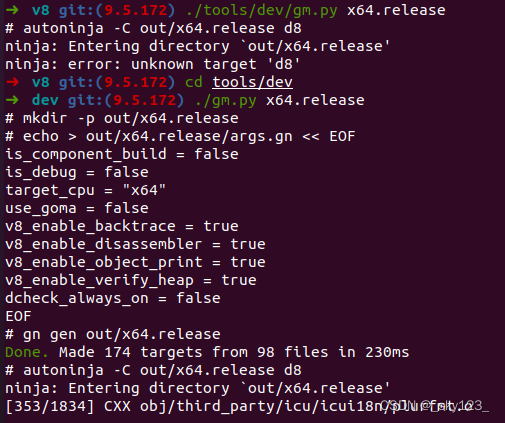 另外如果出现路径错误需要切换到 ./tools/dev/ 路径再进行编译。不过这样编译最终生成的 d8 在 tools/dev/out/x64.release 目录下。 完成后是这个样子 出现这个错误是因为 out 目录下的 x64.release 文件夹没有删。