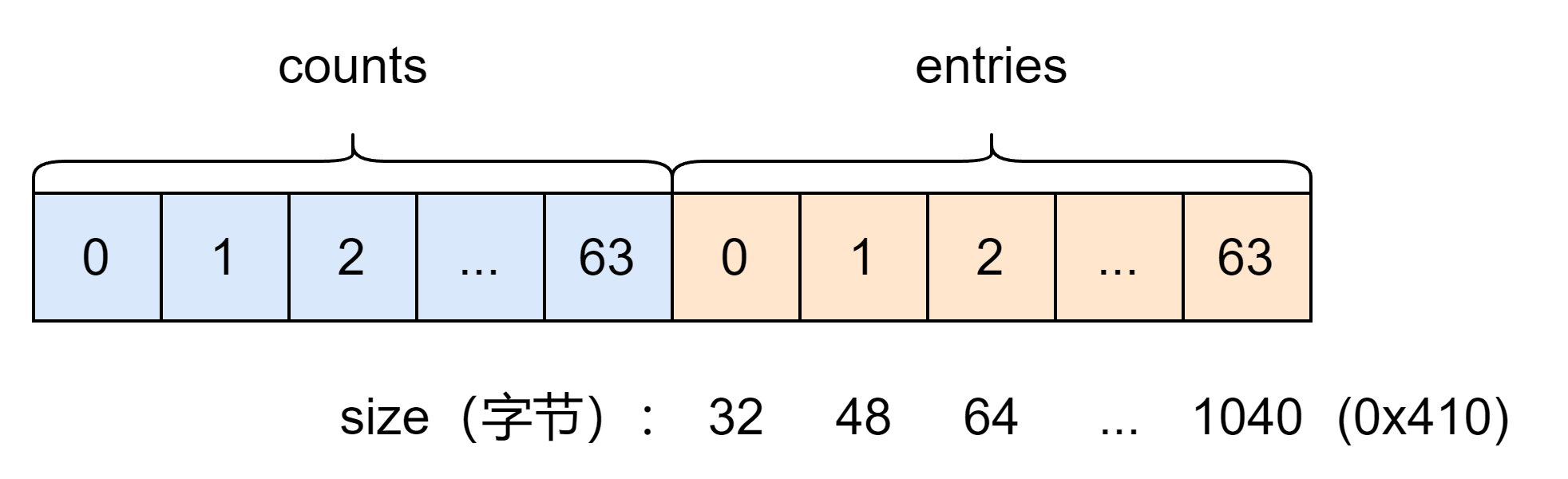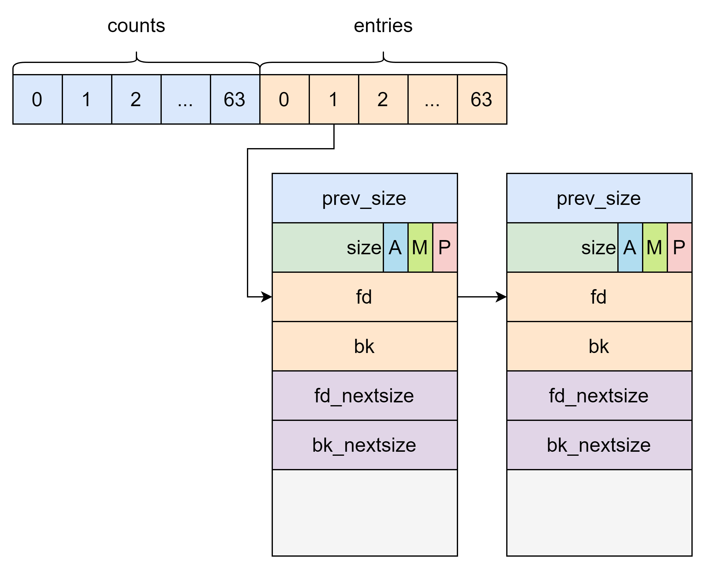 1 2 3 4 5 6 7 8 9 typedef struct tcache_perthread_struct { char counts[TCACHE_MAX_BINS]; tcache_entry *entries[TCACHE_MAX_BINS]; } tcache_perthread_struct; # define TCACHE_MAX_BINS 64 static __thread tcache_perthread_struct *tcache = NULL ;
