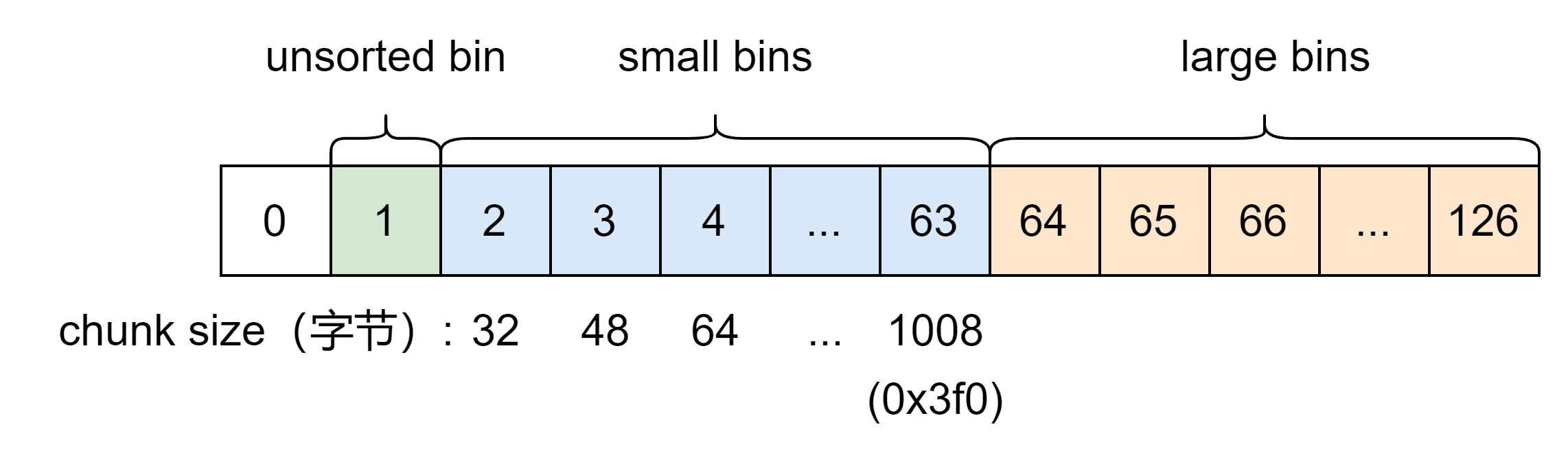 bins:存放闲置 chunk 的数组。bins 包括 large bin,small bin 和 unsorted bin 。
