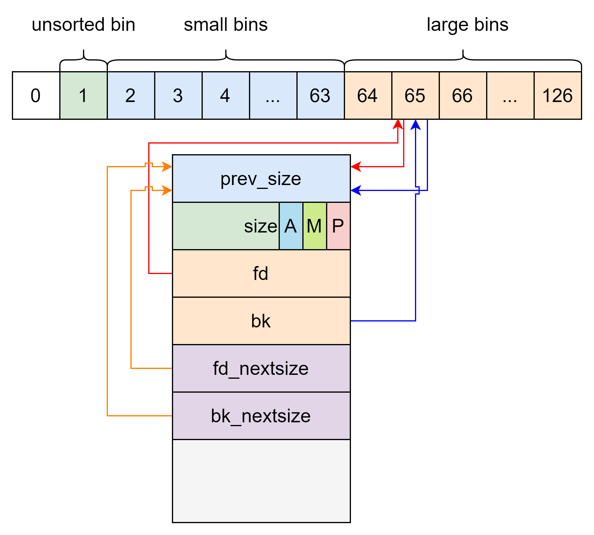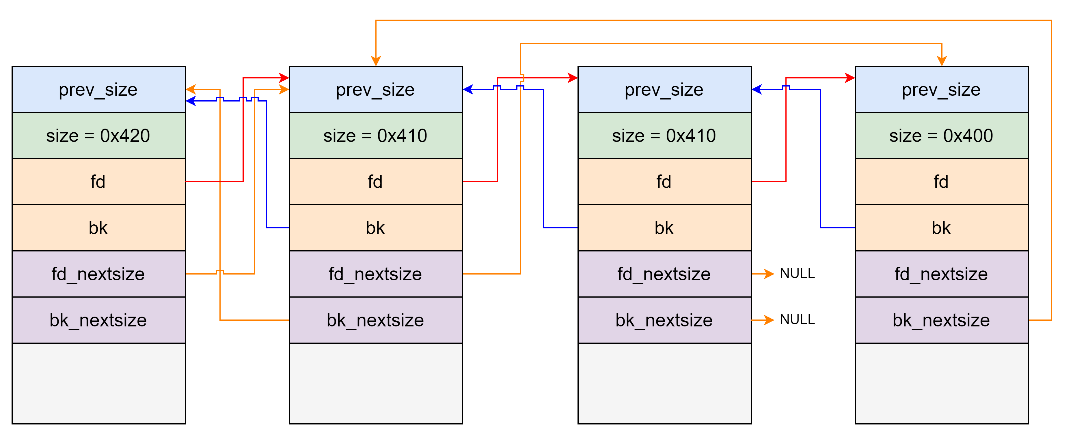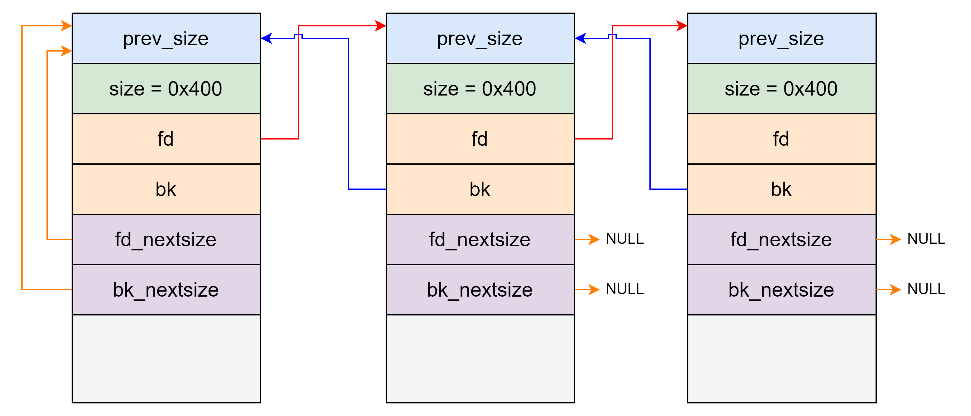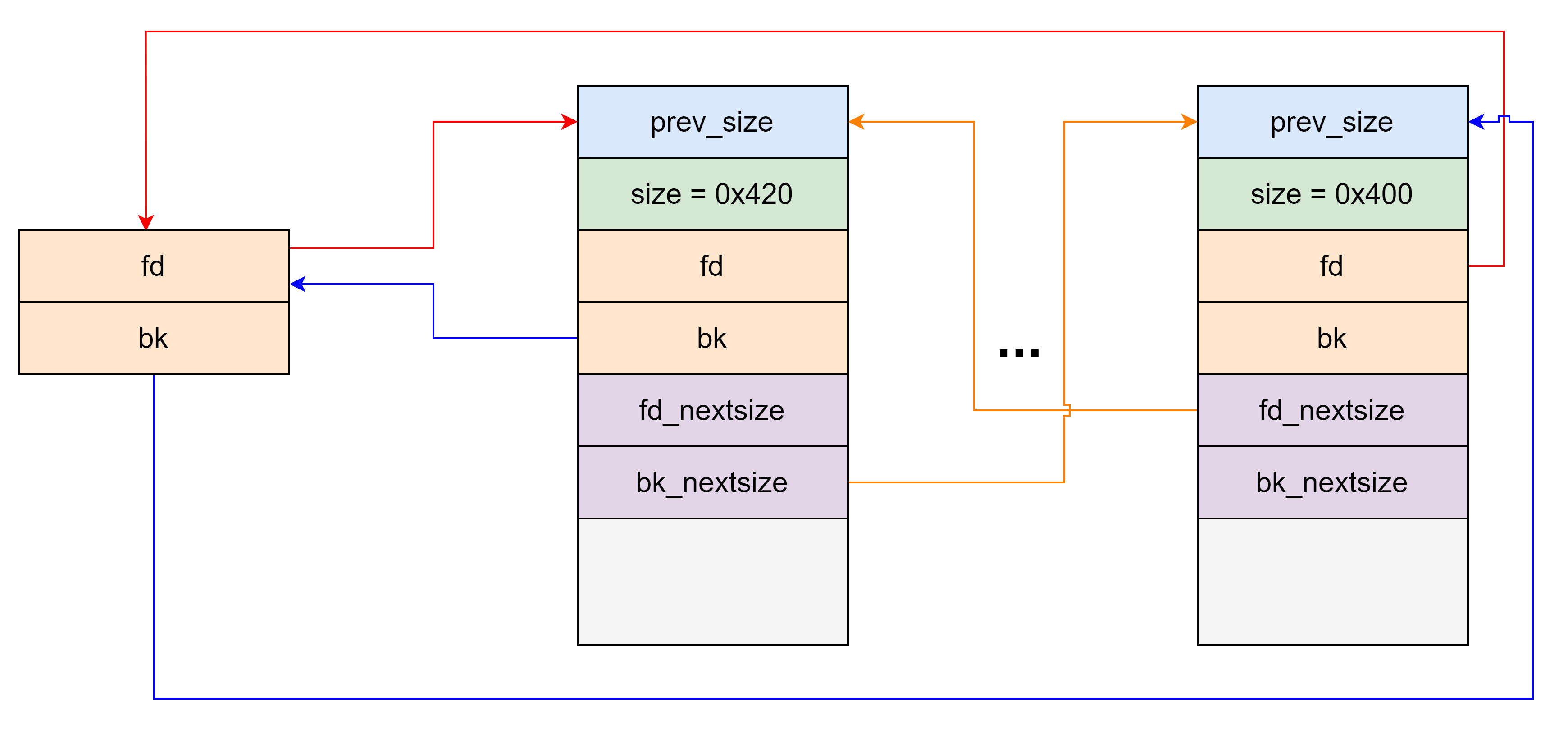 large bin 最小的一组 chunk 中的第一个 chunk 的 fd_nextsize 连接的是最大的 chunk,最大的 chunk 的 bk_nextsize 相反。