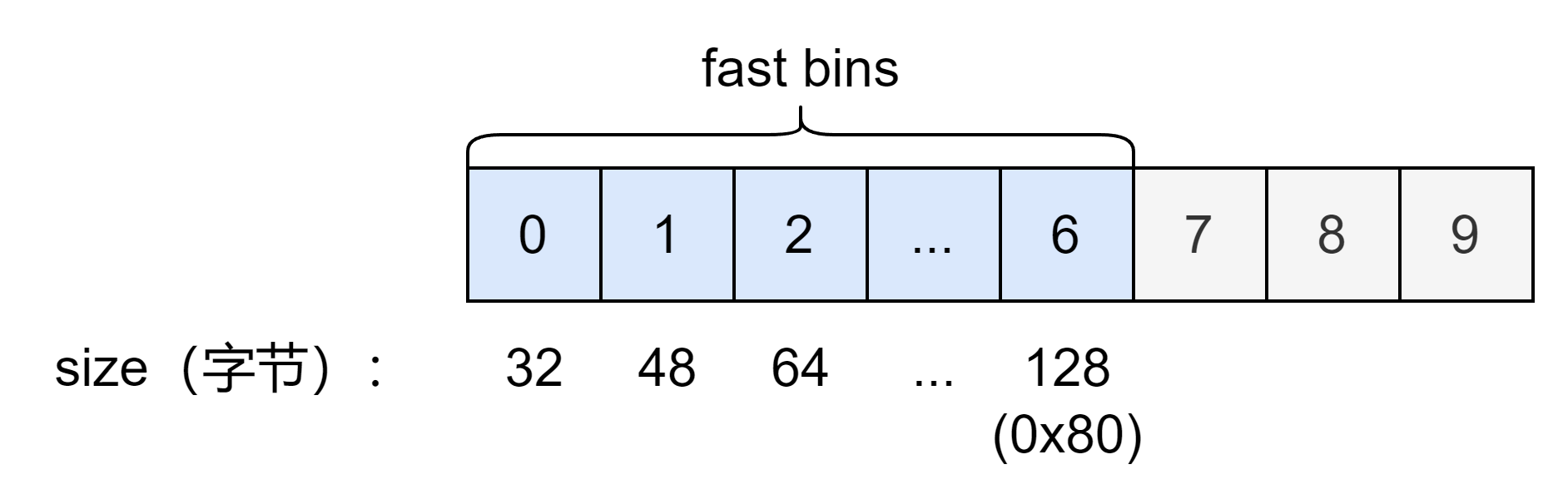 每个 fast bin 中维护的 chunk 大小确定,并且 fast bin 维护的最大的 chunk 为 128 字节(64位),因此不超过 0x80(chunk 大小)的内存释放会进入 fast bin 。
