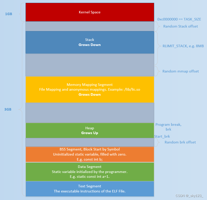 不开启 ASLR 保护时,start_brk 以及 brk 会指向 data/bss 段的结尾。 开启 ASLR 保护时,start_brk 以及 brk 也会指向同一位置,只是这个位置是在 data/bss 段结尾后的随机偏移处。