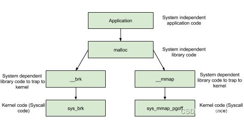 堆管理器负责向操作系统申请内存,然后将其返回给用户程序,但是频繁的系统调用会造成大量的开销。为了保持内存管理的高效性,内核一般都会预先分配很大的一块连续的内存,然后让堆管理器通过某种算法管理这块内存。只有当出现了堆空间不足的情况,堆管理器才会再次与操作系统进行交互。