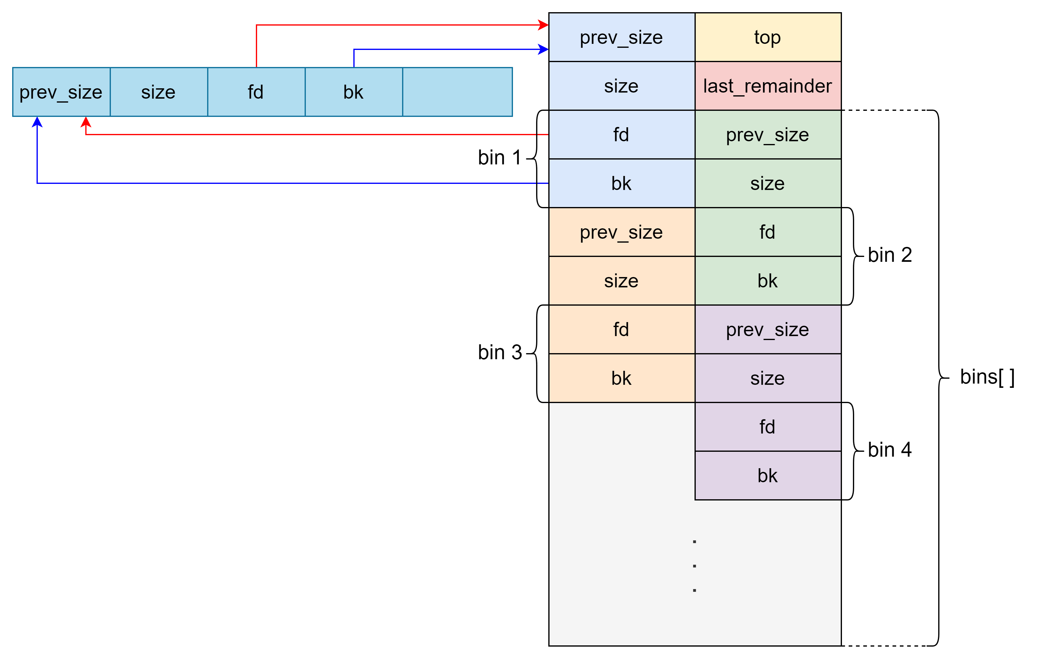 1 2 3 4 5 6 7 8 9 10 11 12 struct malloc_chunk { INTERNAL_SIZE_T prev_size; INTERNAL_SIZE_T size; struct malloc_chunk * fd; struct malloc_chunk * bk; struct malloc_chunk * fd_nextsize; struct malloc_chunk * bk_nextsize; };