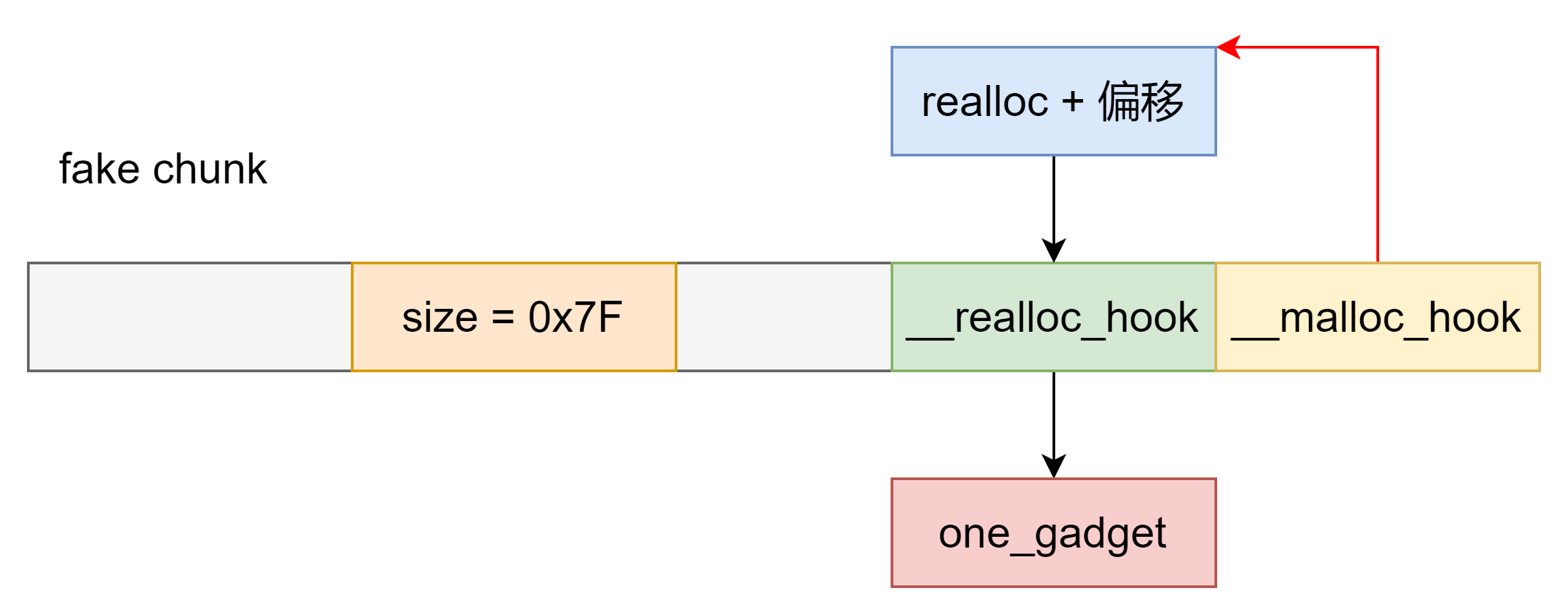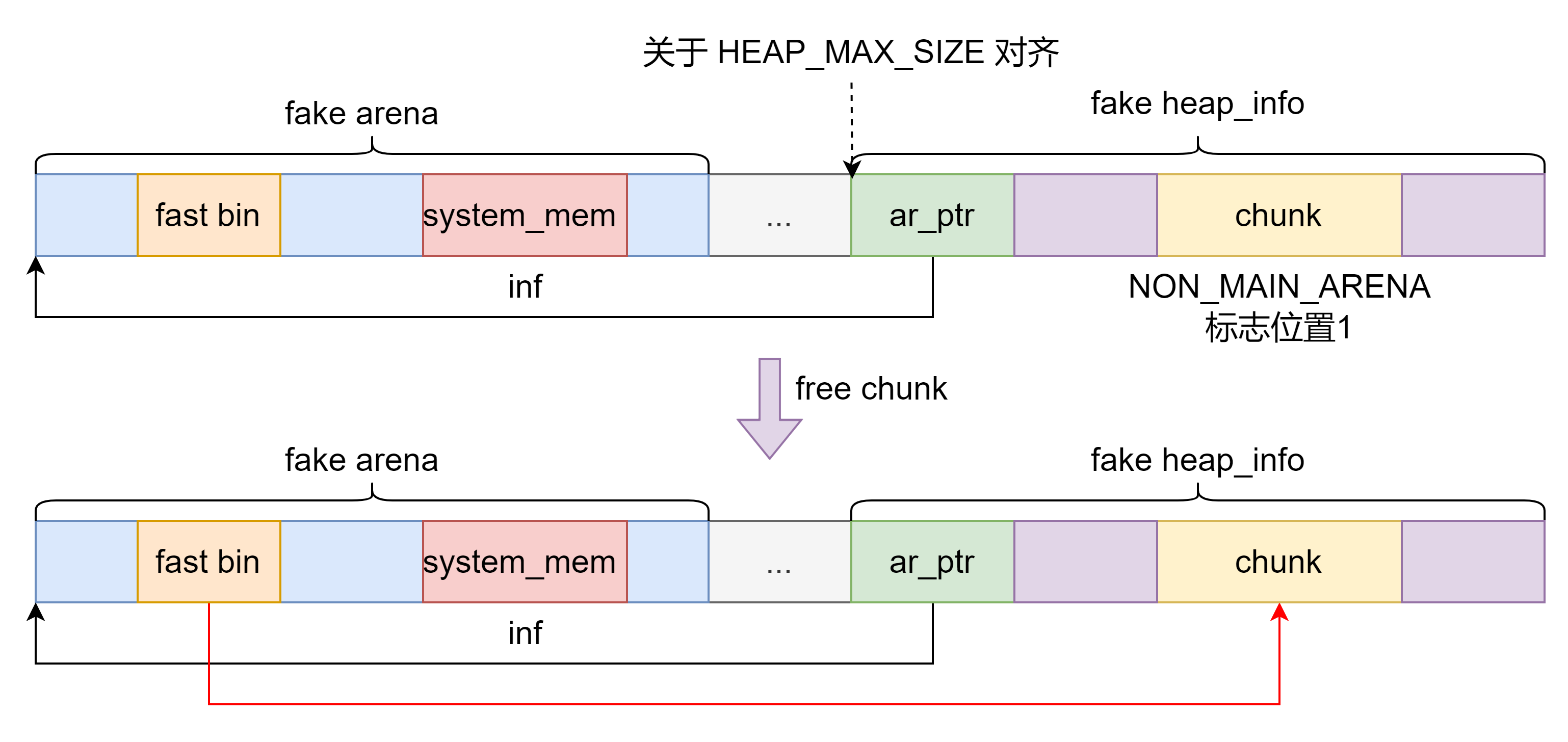 如下图所示,在目标位置处伪造 fastbin chunk,并将其释放,从而达到分配指定地址的 chunk 的目的。