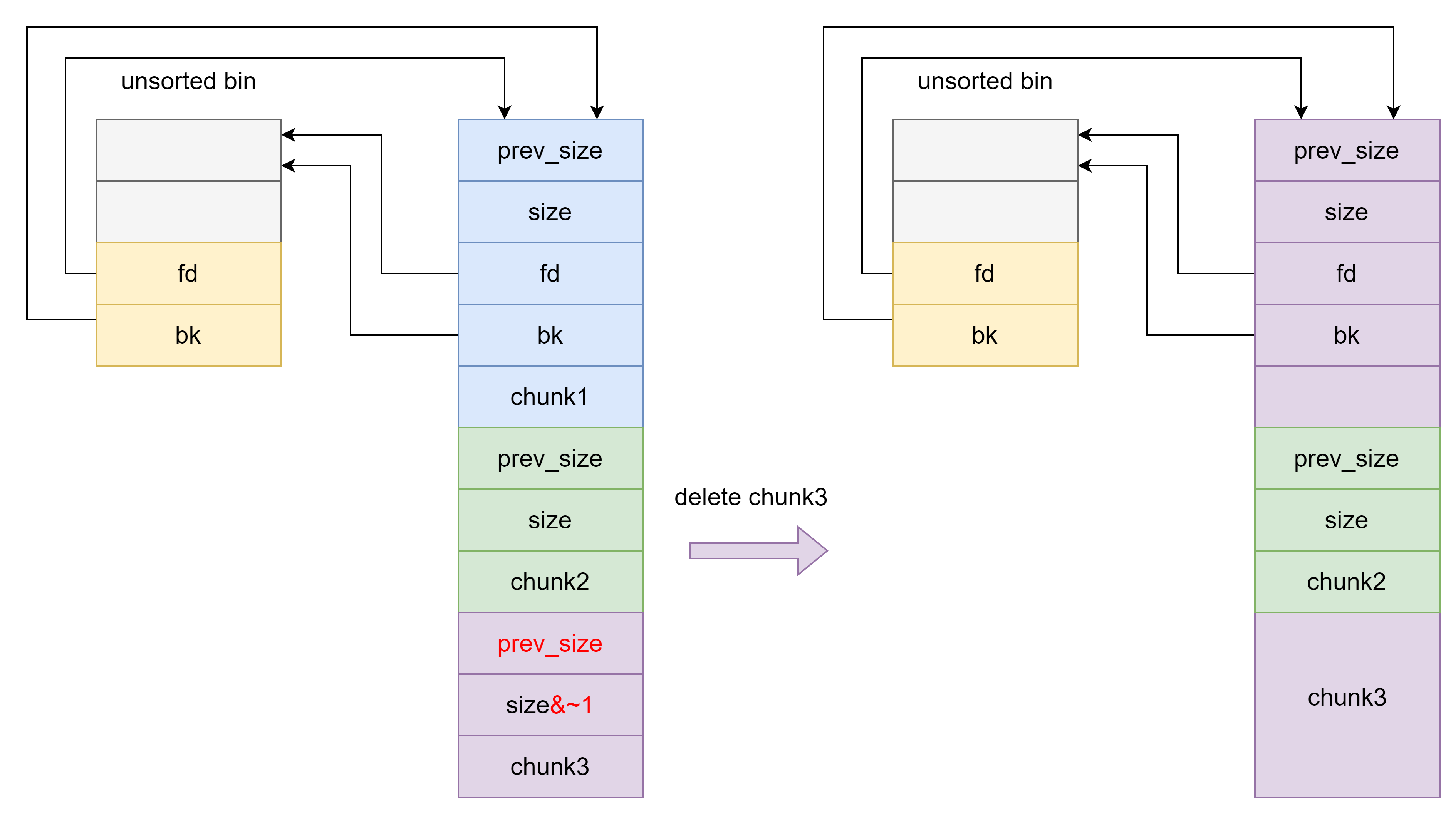 为了能使得 chunk2 与 fake chunk 合并,chunk2 的 size 的 PREV_INUSE 位 为 0 ,且 chunk2 的大小不能在 fast bin 范围。