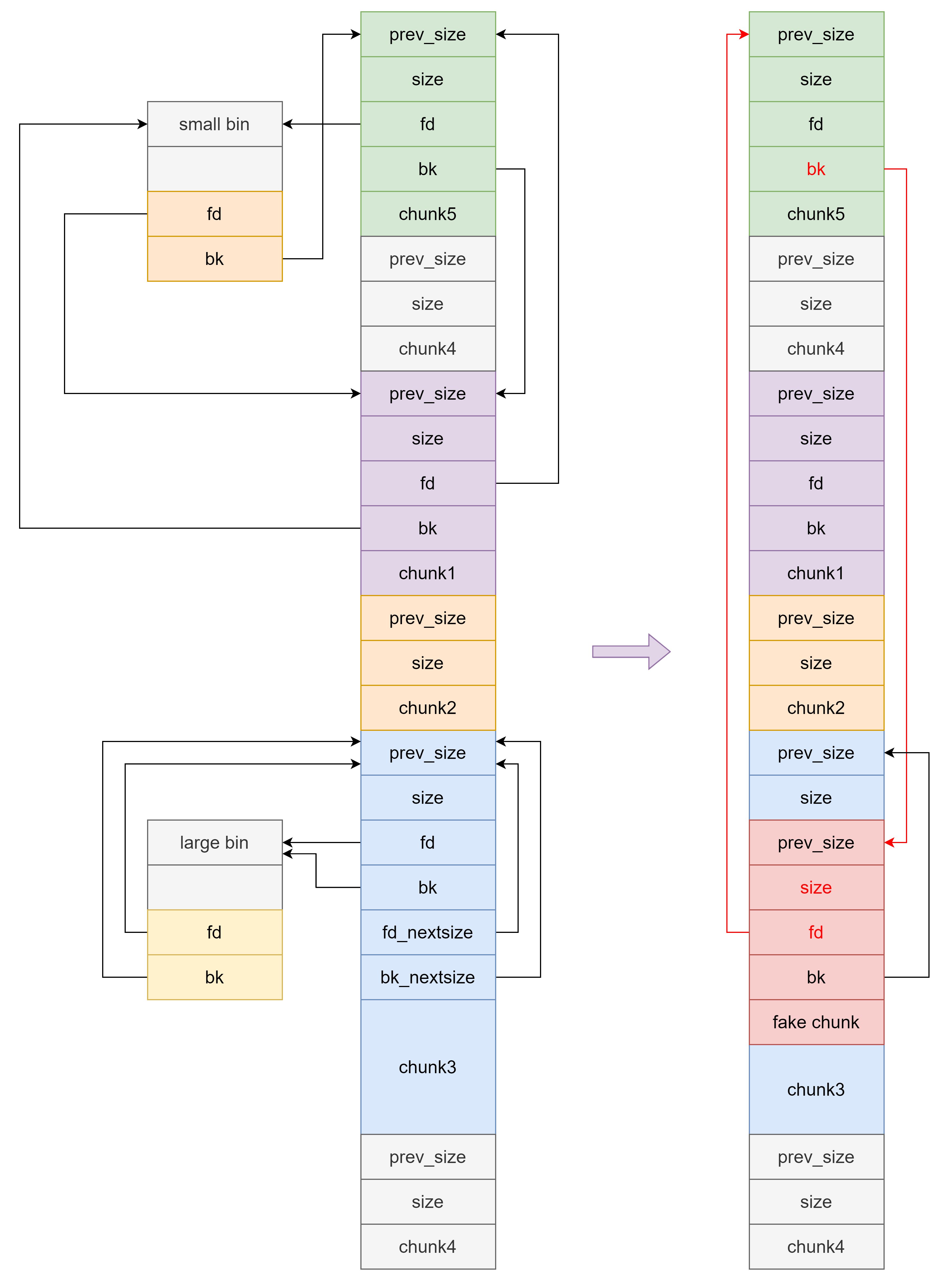 malloc_printerr(check_action, "corrupted double-linked list (not small)", P, AV);fake chunk 大小应在 small bin 范围。