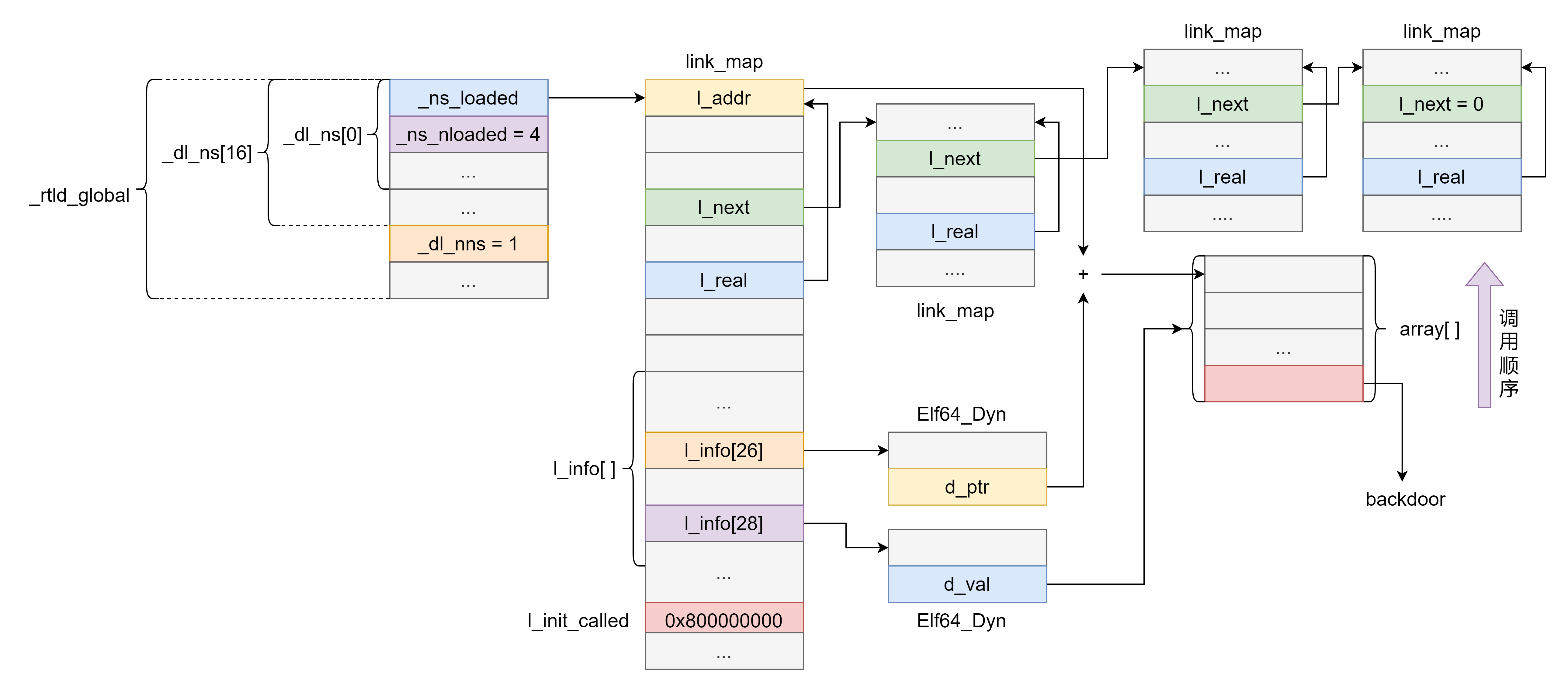 最终伪造的结构如下图所示,其中 link_map 链表可以伪造到一个 chunk 中,或者将 l_next 指针指向原来的 link_map 链表: