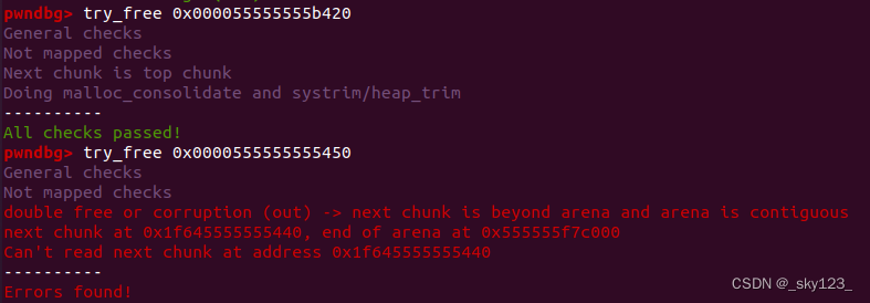 pwndbg 的 try_free 命令可以检查是否能成功 free 。