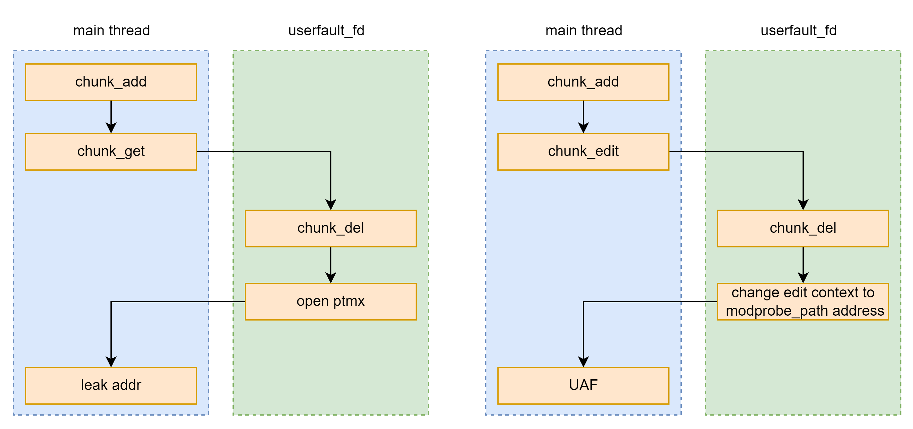 上面这种方法构造 Race condition 需要 sleep 效率较低,即使保存泄露的基址避免重复爆破依然需要长时间爆破。 不难想到,可以将子线程的逻辑写到 userfaule_fd 的处理函数中,因为页错误发生和处理页错误的顺序是确定的,因此保证了 Race condition 的顺序。这样就可以避免通过 sleep 时长来控制先后顺序。