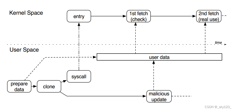 Race condition double fetch 用户空间向内核传递数据时,内核先通过通过 copy_from_user 等拷贝函数将用户数据拷贝至内核空间进行校验及相关处理,但在输入数据较为复杂时,内核可能只引用其指针,而将数据暂时保存在用户空间进行后续处理。此时,该数据存在被其他恶意线程篡改风险,造成内核验证通过数据与实际使用数据不一致,导致内核代码执行异常。 一个典型的 Double Fetch 漏洞原理如下图所示,一个用户态线程准备数据并通过系统调用进入内核,该数据在内核中有两次被取用,内核第一次取用数据进行安全检查(如缓冲区大小、指针可用性等),当检查通过后内核第二次取用数据进行实际处理。而在两次取用数据之间,另一个用户态线程可创造条件竞争,对已通过检查的用户态数据进行篡改,在真实使用时造成访问越界或缓冲区溢出,最终导致内核崩溃或权限提升。
