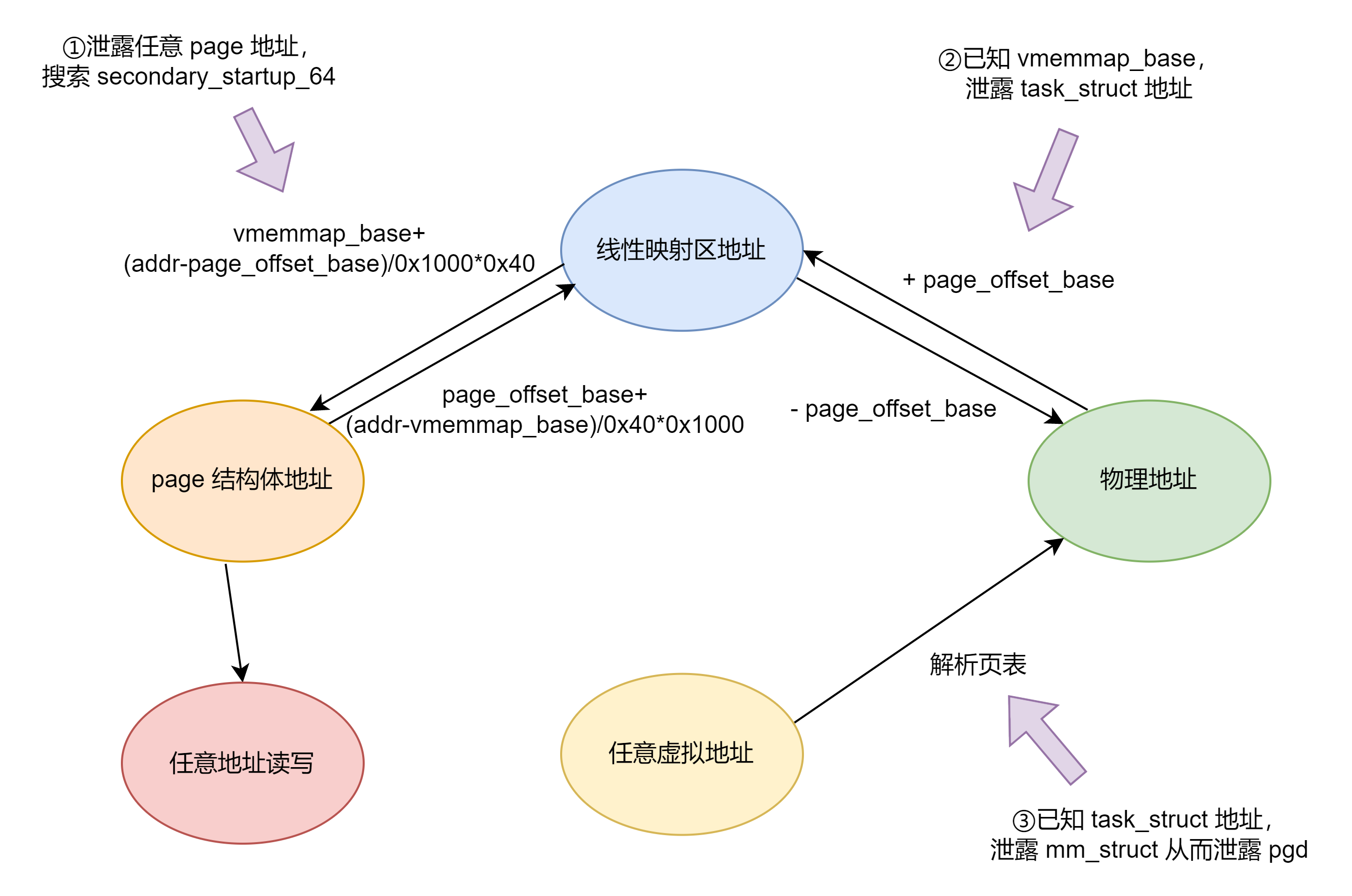 利用漏洞泄露出内核的“堆”上地址(通过 kmalloc 获取到的地址),这个地址直接来自于线性映射区