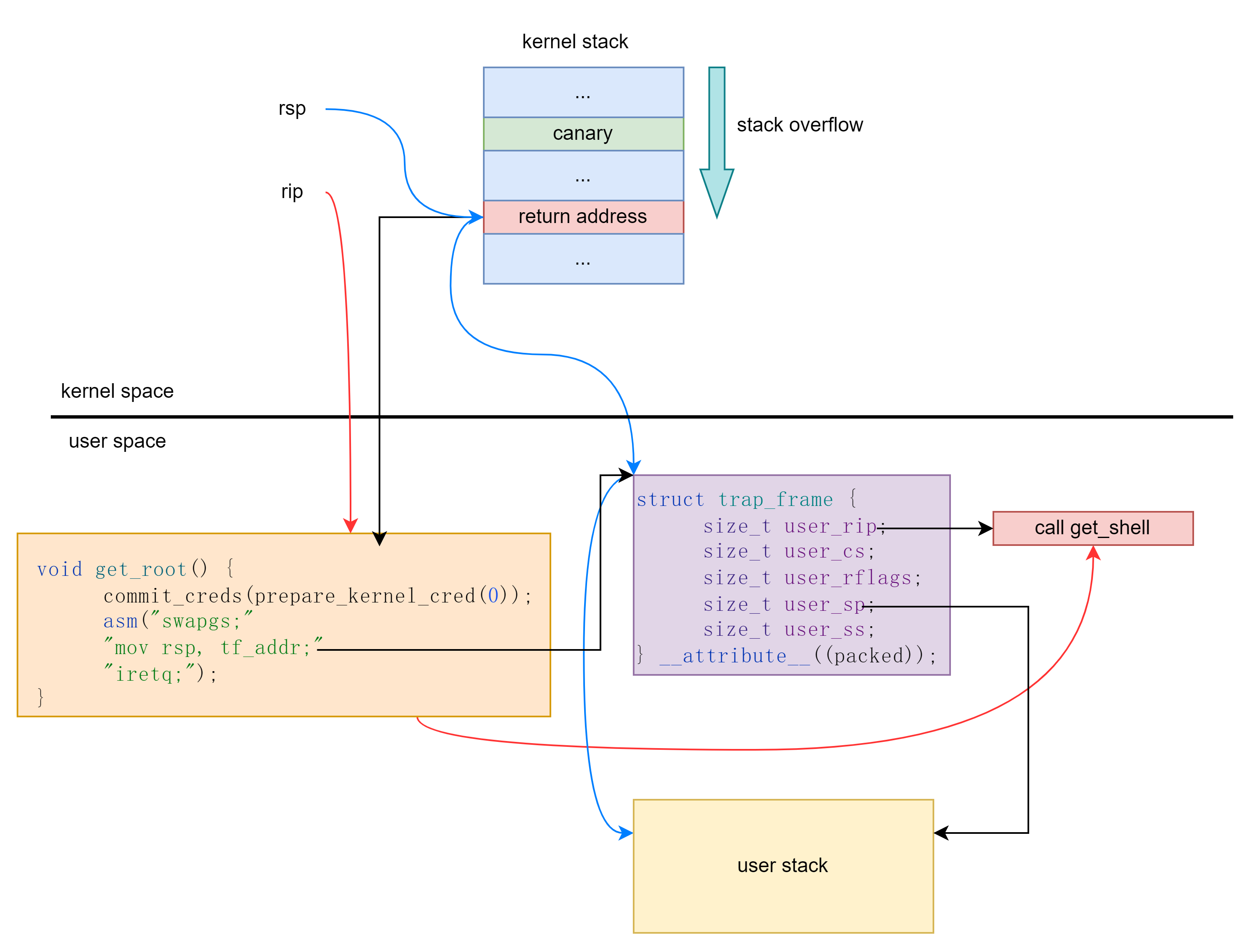 如果找不到 swapgs_restore_regs_and_return_to_usermode 则可以为 SIGSEGV 注册异常处理函数 get_shell ,然后按照没有 kpti 的方式返回用户态。触发异常后自动完成用户态的返回。