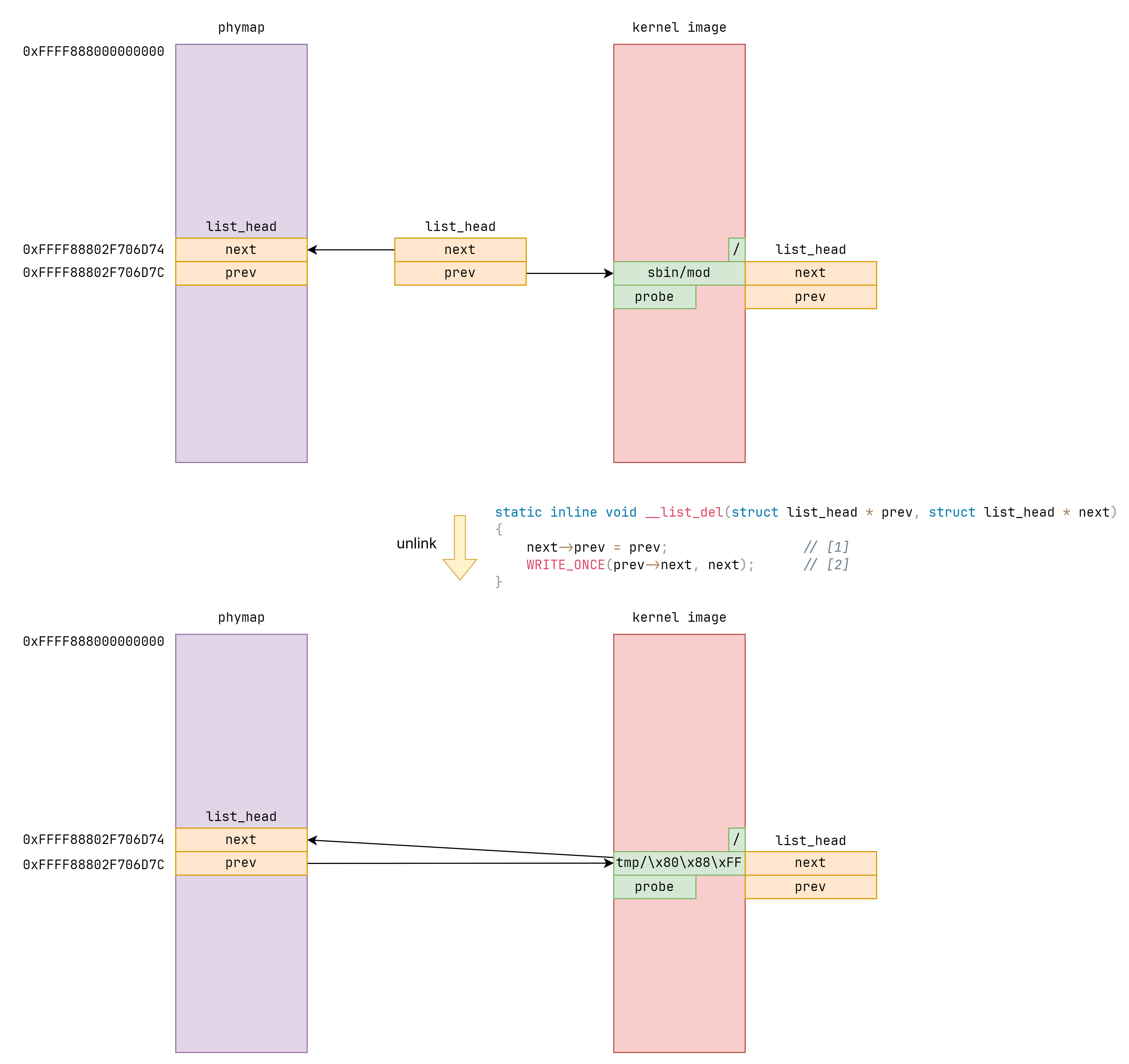 unlink 基于 list_del 操作。伪造两个地址来替代 list_head ,这样其中一个地址就会被写到另一个地址上。如果我们能够控制 prev / next 指针,可以把 prev 指针设置为 modprobe_path ,这样就会在 [2] 处将 next 值写入 prev 指向的内存。