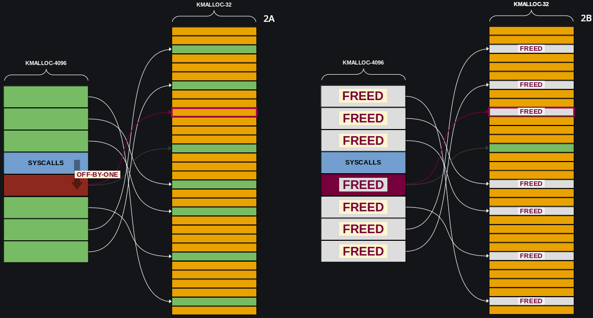 这样我们有很大概率构造出上面那种情况,从而可以溢出到其他的内核结构体上完成 cross-cache overflow 。