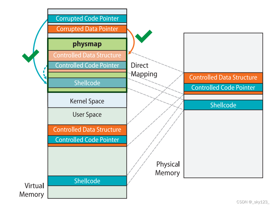 需要注意的是我们往往没有内存搜索的机会,因此需要使用 mmap 喷射大量的物理内存写入同样的 payload,之后再随机挑选一个线性映射区上的地址进行利用,这样我们就有很大的概率命中到我们布置的 payload 上,这种攻击手法也称为 physmap spray 。