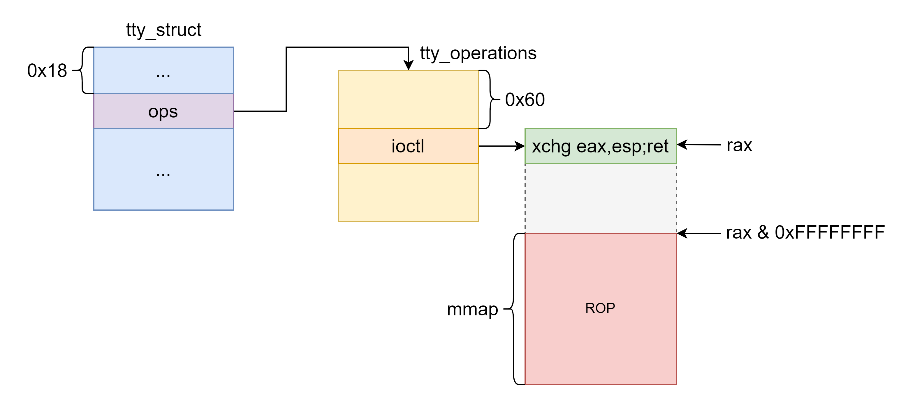因此我们只需要像上一种方法那样利用 UAF 修改 tty_struct 的结构体指针 ops (这里不直接劫持 tty_operations 的原因是 tty_operations 已经实例化的,不是动态申请的,类似 glibc 中的 _IO_XX_jumps )然后再调用 tty 的相关操作函数就可以劫持控制流,实现我们想要的操作。 然而如果仅仅是靠修改 tty_operations 结构体中某函数指针只能写入一个 gadget ,除了使用 pt_regs + ret2dir 外还有下面这种方法。