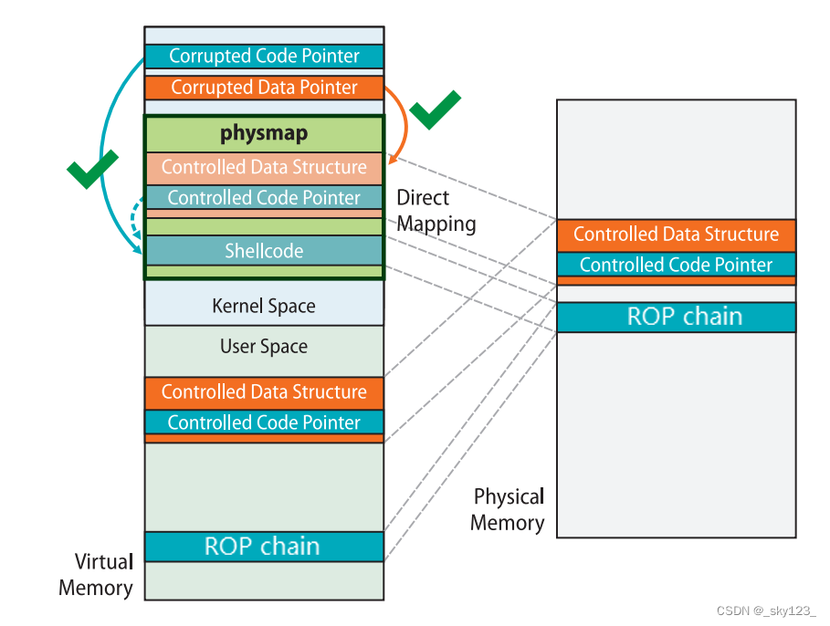 下图便是原论文中对 ret2dir 这种攻击的示例,我们在用户空间中布置的 gadget 可以通过 direct mapping area 上的地址在内核空间中访问到 但需要注意的是在新版的内核当中 direct mapping area 已经不再具有可执行权限,因此我们很难再在用户空间直接布置 shellcode 进行利用,但我们仍能通过在用户空间布置 ROP 链的方式完成利用 比较朴素的一种使用 ret2dir 进行攻击的手法便是: