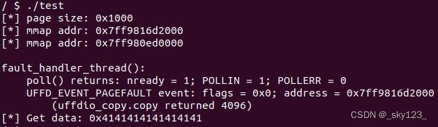运行结果如图,自定义的缺页处理函数向缺页处写入了数据。需要说明的是,自从 5.11 版本起内核 fs/userfaultfd.c 中全局变量 sysctl_unprivileged_userfaultfd 初始化为 1,这意味着只有 root 权限用户才能使用 userfaultfd 。