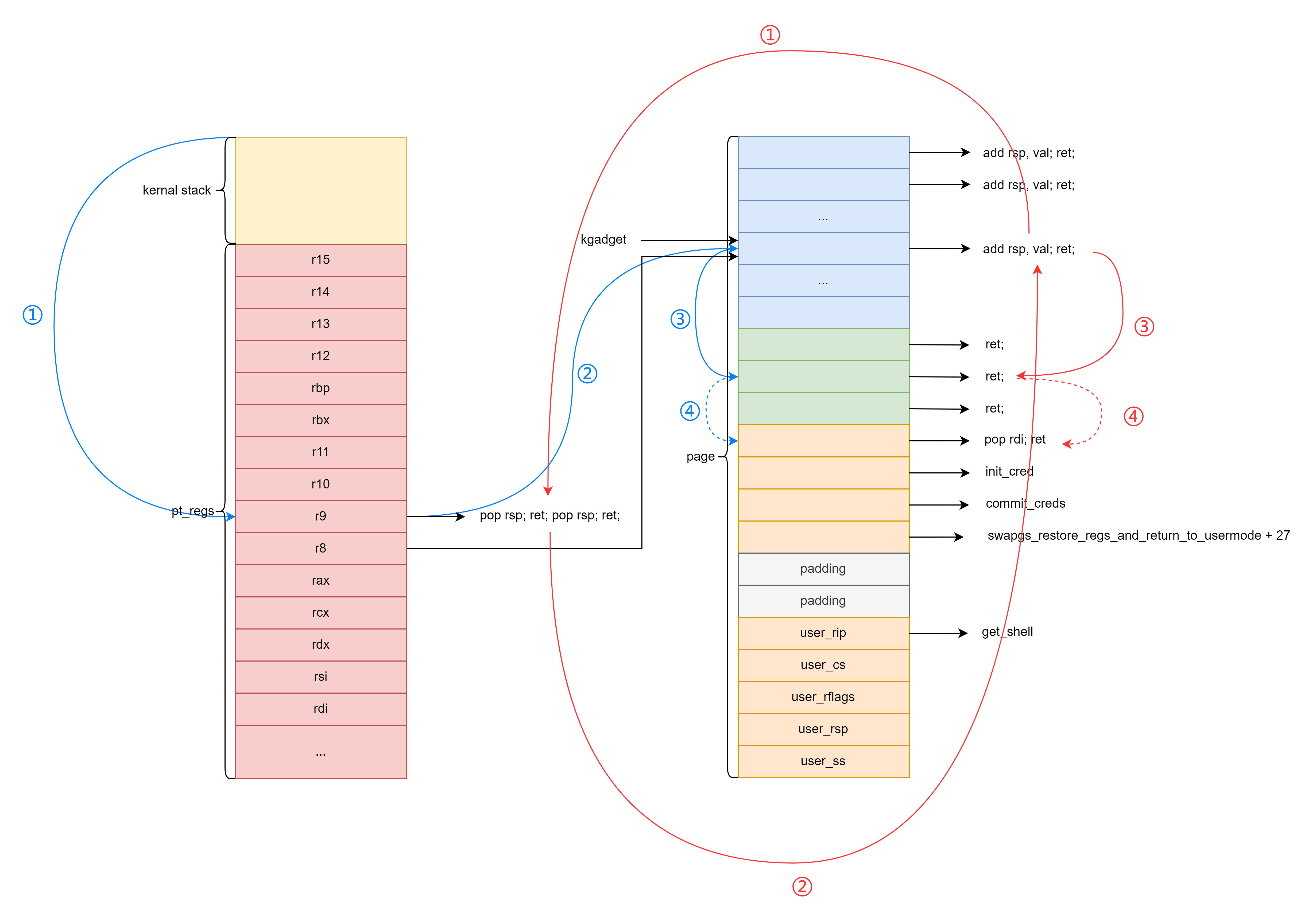 ret2dir 如果 ptregs 所在的内存被修改了导致最多只能控制 16 字节的内存我们可以利用 ret2dir 的利用方式将栈迁移至内核的线性映射区。