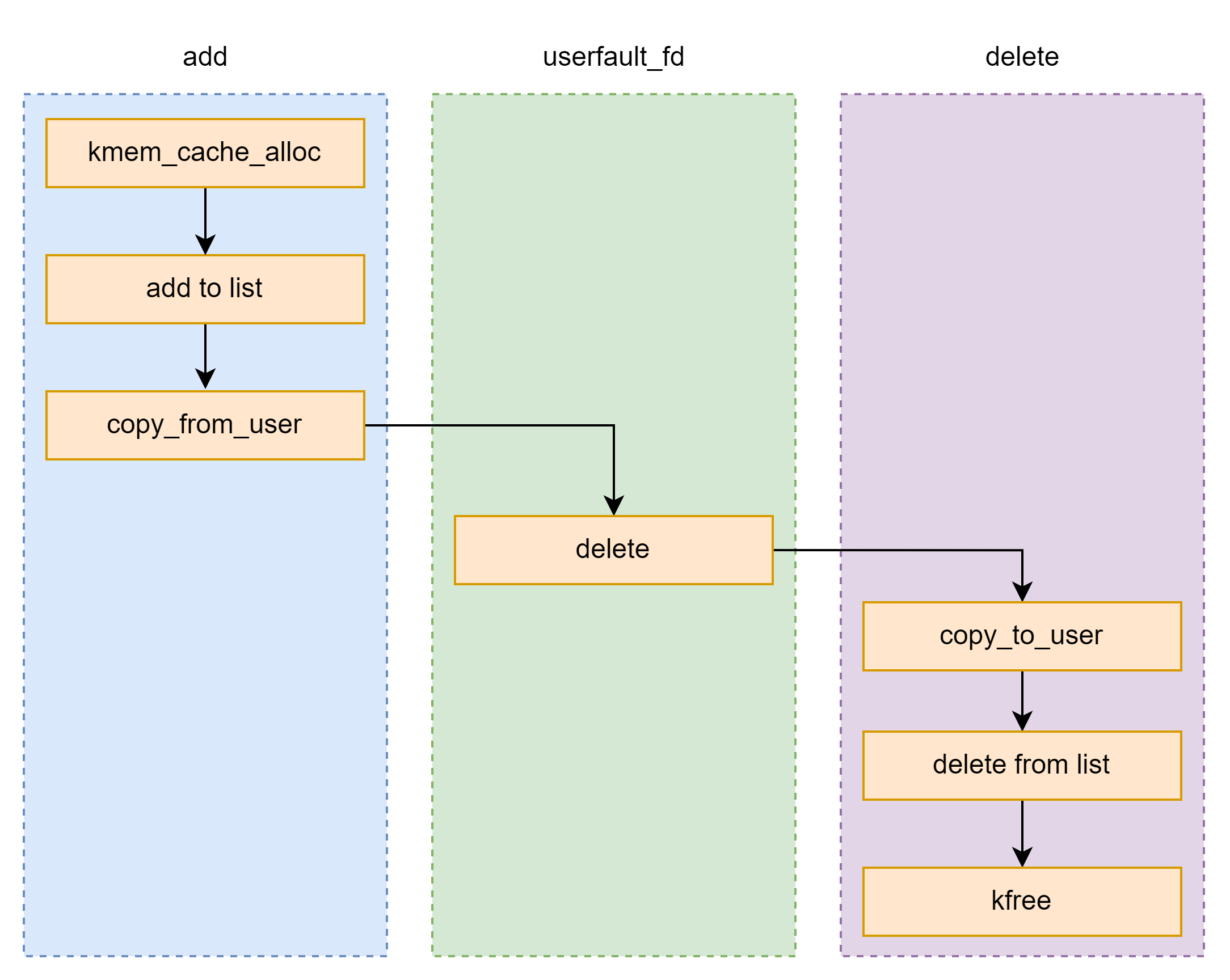 主要有 add 和 del 两个功能。 这里注意到 add 功能是先将申请的内存块添加到链表中,然后再 copy_from_user 写入内容;而 del 功能是先找到要删除的内存块 copy_to_user 将内容复制出来再将其从链表中取出并释放掉。 也就是说当无论是 copy_from_user 还是 copy_to_user ,要操作的内存块依旧在链表中,此时借助 userfaultfd 可以再次对其进行 del 操作从而构造出 uaf 和 double free 。 因此漏洞利用思路如下: