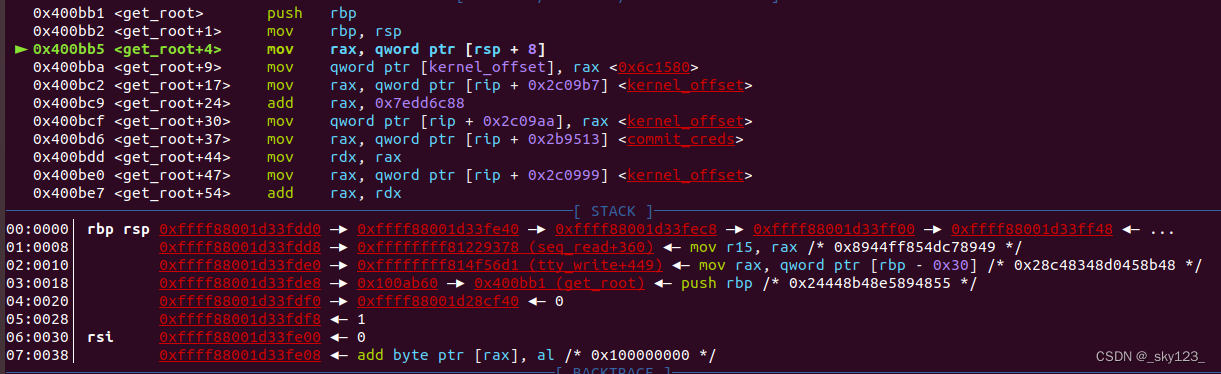 通过 tty_struct 执行 ioctl 时, rax 的值正好是 rip 的值,也就是 tty_operations 中 ioctl 函数指针指向的指令的地址。 如果向 ioctl 函数指针写入 xchg eax,esp;ret 指令地址,则会将 rsp 的值置为 rax & 0xffffffff ,即将栈迁移至 rax & 0xffffffff 地址处。如果我们提前在 rax & 0xffffffff 地址处布置好 rop 则可以完成提权操作。 这里需要注意的是: