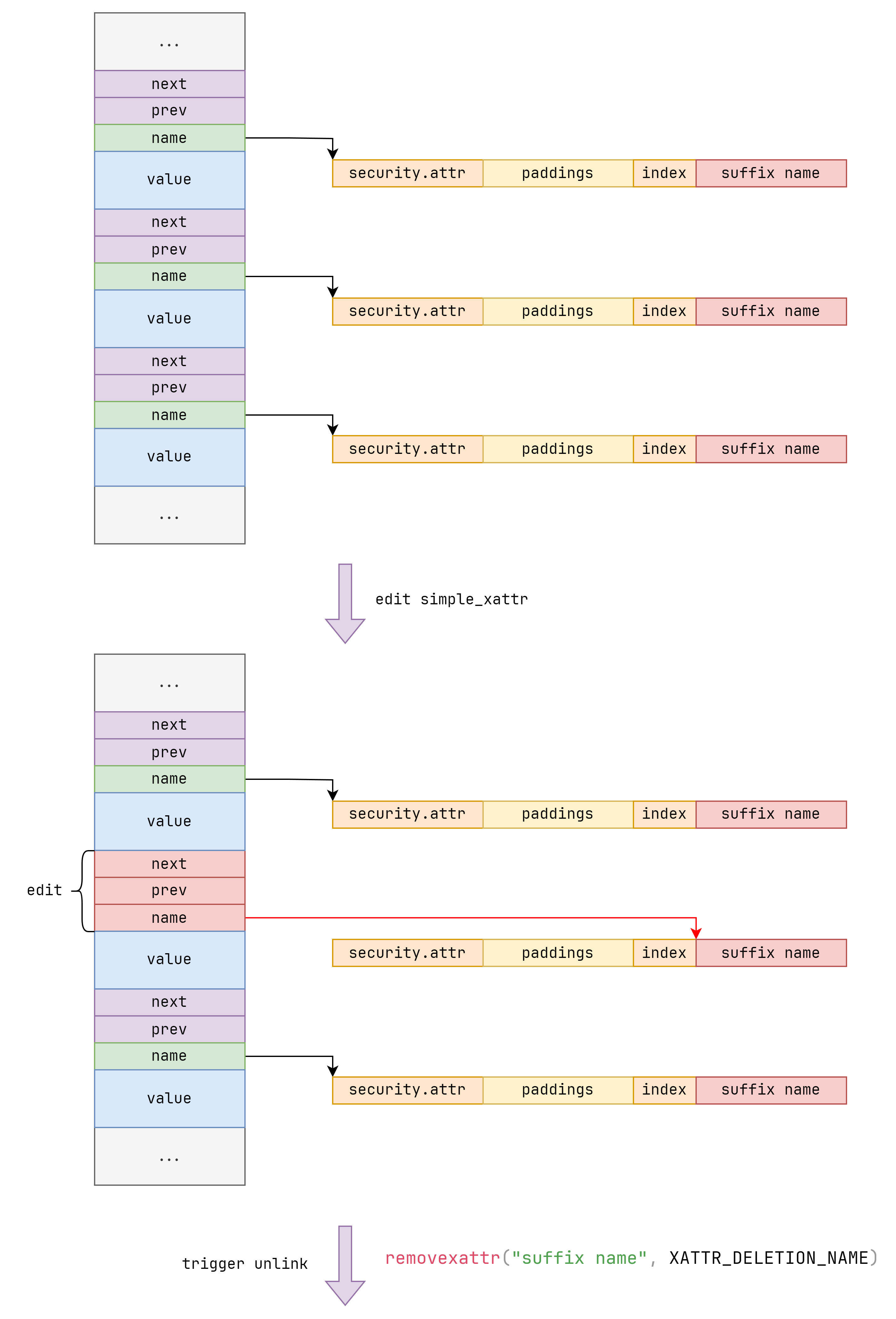 1 2 3 4 5 6 7 8 9 10 struct simple_xattr { struct list_head list ; char *name; size_t size; char value[]; }; struct list_head { struct list_head *next , *prev ; };