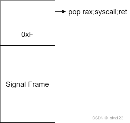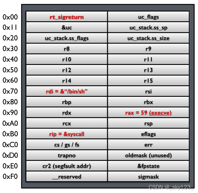 以 64 位为例,其中一种构造方式如下: 其中 0xF 为 rt_sigreturn 的系统调用号。 Signal Frame 结构如下: 通过设置 Signal Frame 的 rsp 的值栈迁移,可以连读多次进行 SROP。 例题:rootersctf_2019_srop