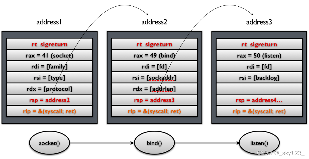 可以完成改 rax 和 系统调用,不过 ret 前多了一个 leave ,因此连续 SROP 时不能像前面示意图那样直接改 rsp ,而是将 rbp 设为目标栈地址 + 8 ,利用栈迁移将栈顶迁移到目标地址。