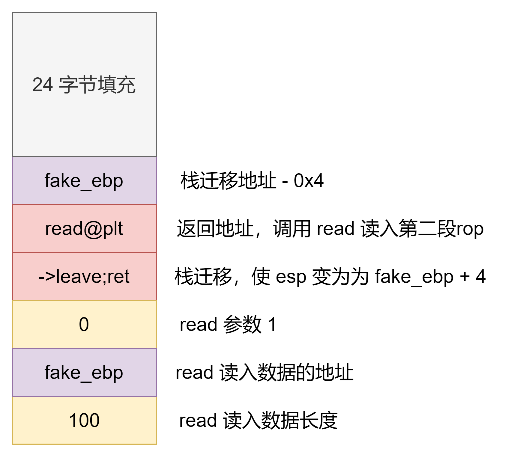 这里返回到read函数时会有push ebp保存ebp值,read函数中的leave;ret语句不会对栈迁移造成影响,因此还要再加一个leave;ret。
