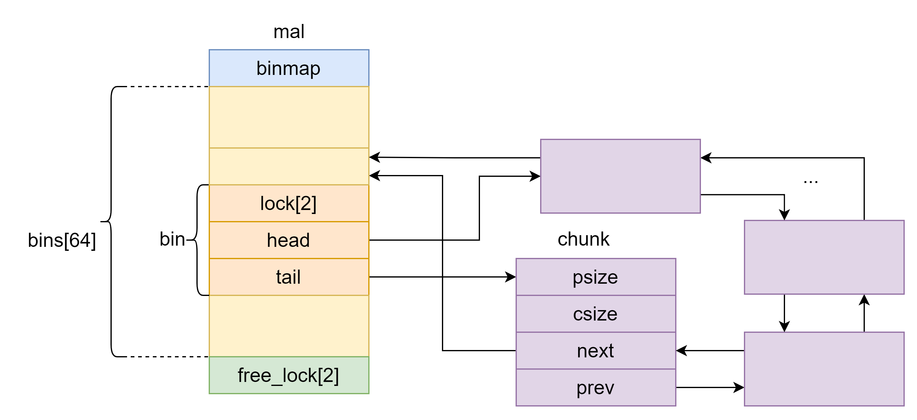 mal 结构体类似于 glibc 中的 arena ,记录着堆的状态,有三个成员:64位无符号整数 binmap ,链表头部数组 bins 和锁 free_lock 。