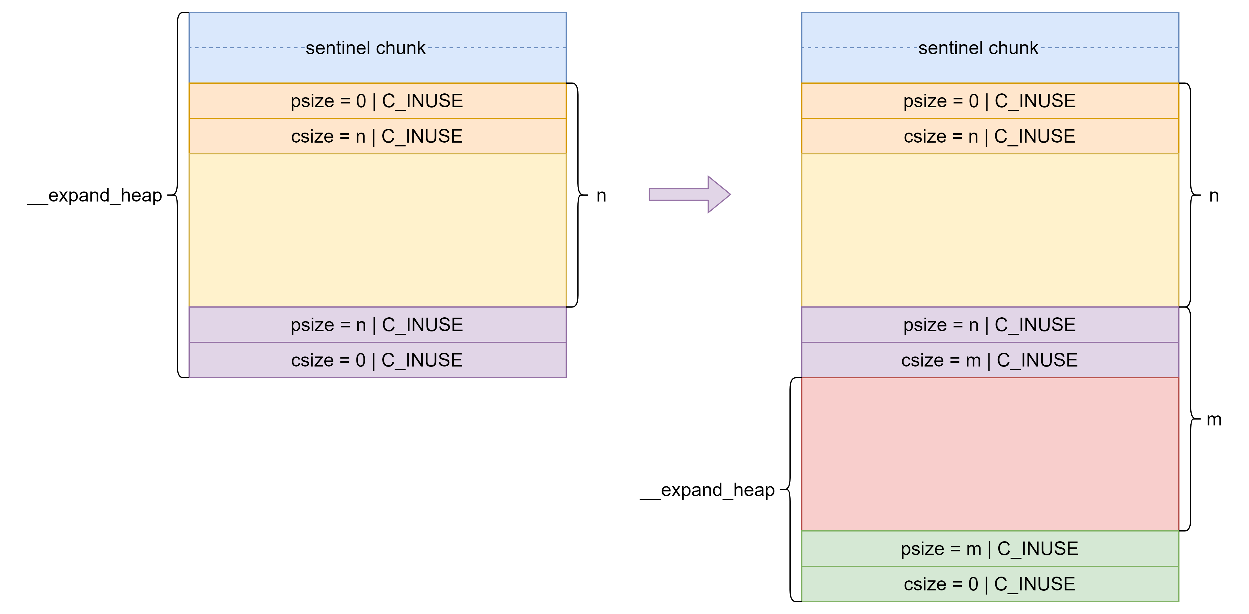 这里假设连续调用两次 expand_heap,则内存分布如下。由此可知道前面 n += SIZE_ALIGN; 是为了确保如果是不连续或第一次扩展堆时有可以有空间提供 sentinel chunk 和下一个 chunk 的头部。