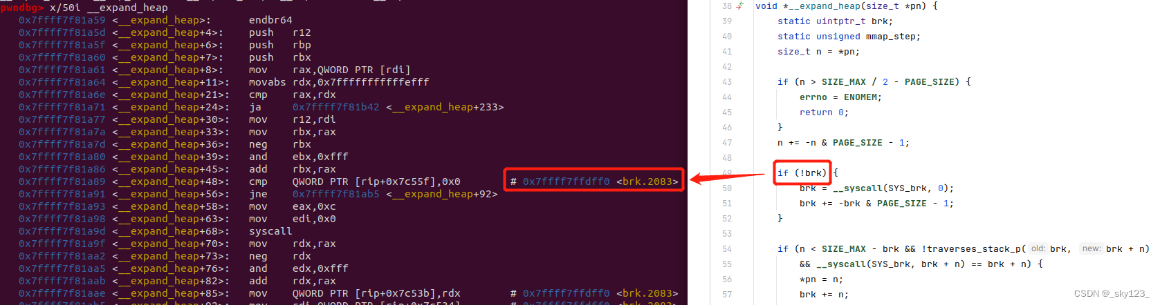 1 2 3 4 if (!brk) { brk = __syscall(SYS_brk, 0 ); brk += -brk & PAGE_SIZE - 1 ; }