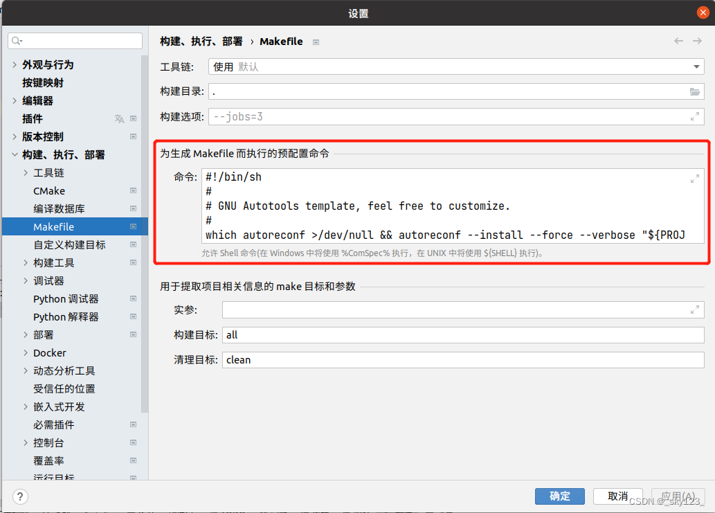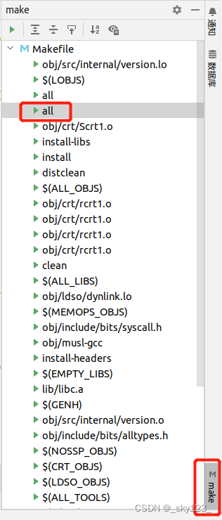 在用 clion 打开 musl 源码后首先在 Mskefile 设置中配置如下命令,注意一定要点命令窗口左上角的箭头将窗口展开后再粘贴,否则格式会出现错误。