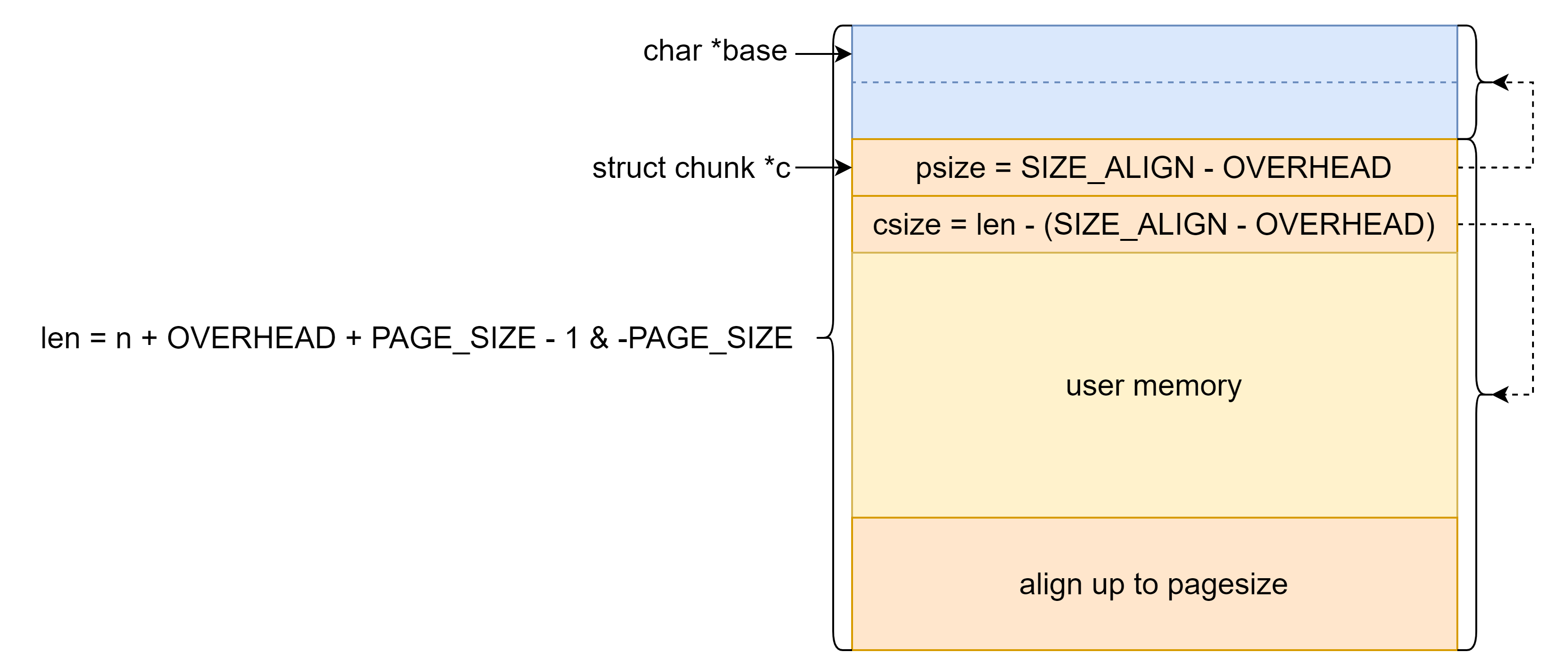 1 2 3 4 5 6 7 8 9 10 if (n > MMAP_THRESHOLD) { size_t len = n + OVERHEAD + PAGE_SIZE - 1 & -PAGE_SIZE; char *base = __mmap(0 , len, PROT_READ | PROT_WRITE, MAP_PRIVATE | MAP_ANONYMOUS, -1 , 0 ); if (base == (void *) -1 ) return 0 ; c = (void *) (base + SIZE_ALIGN - OVERHEAD); c->csize = len - (SIZE_ALIGN - OVERHEAD); c->psize = SIZE_ALIGN - OVERHEAD; return CHUNK_TO_MEM(c); }