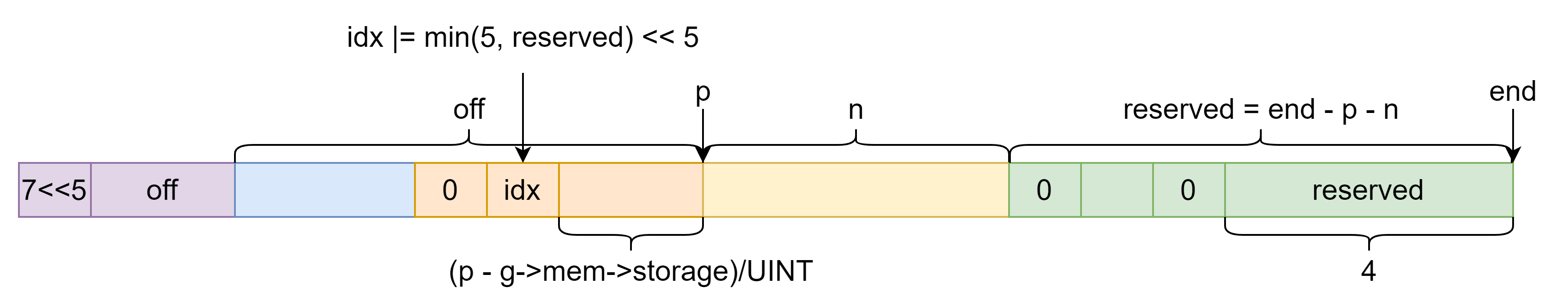 1 2 3 4 5 6 7 8 9 10 11 12 13 14 15 static inline void set_size (unsigned char *p, unsigned char *end, size_t n) { int reserved = end - p - n; if (reserved) end[-reserved] = 0 ; if (reserved >= 5 ) { *(uint32_t *) (end - 4 ) = reserved; end[-5 ] = 0 ; reserved = 5 ; } p[-3 ] = (p[-3 ] & 31 ) + (reserved << 5 ); } *(uint16_t *) (p - 2 ) = (size_t ) (p - g->mem->storage) / UNIT; p[-3 ] = idx; set_size(p, end, n); return p;