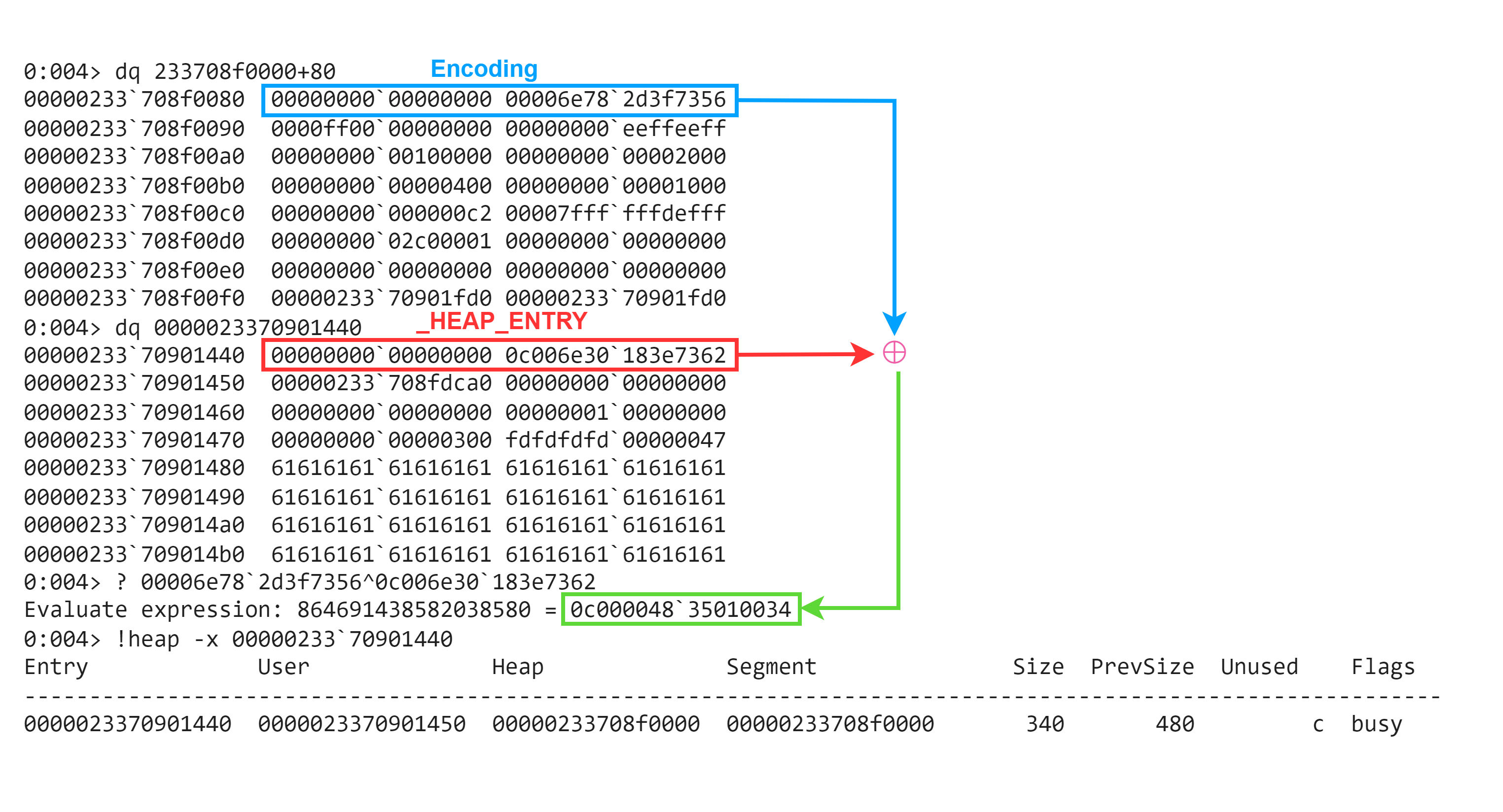 PageSegment->Signature = PageSegment ^ RtlpHpHeapGlobals.HeapKey ^ HeapSegContext ^ 0xA2E64EADA2E64EADui64。 - 将新申请的