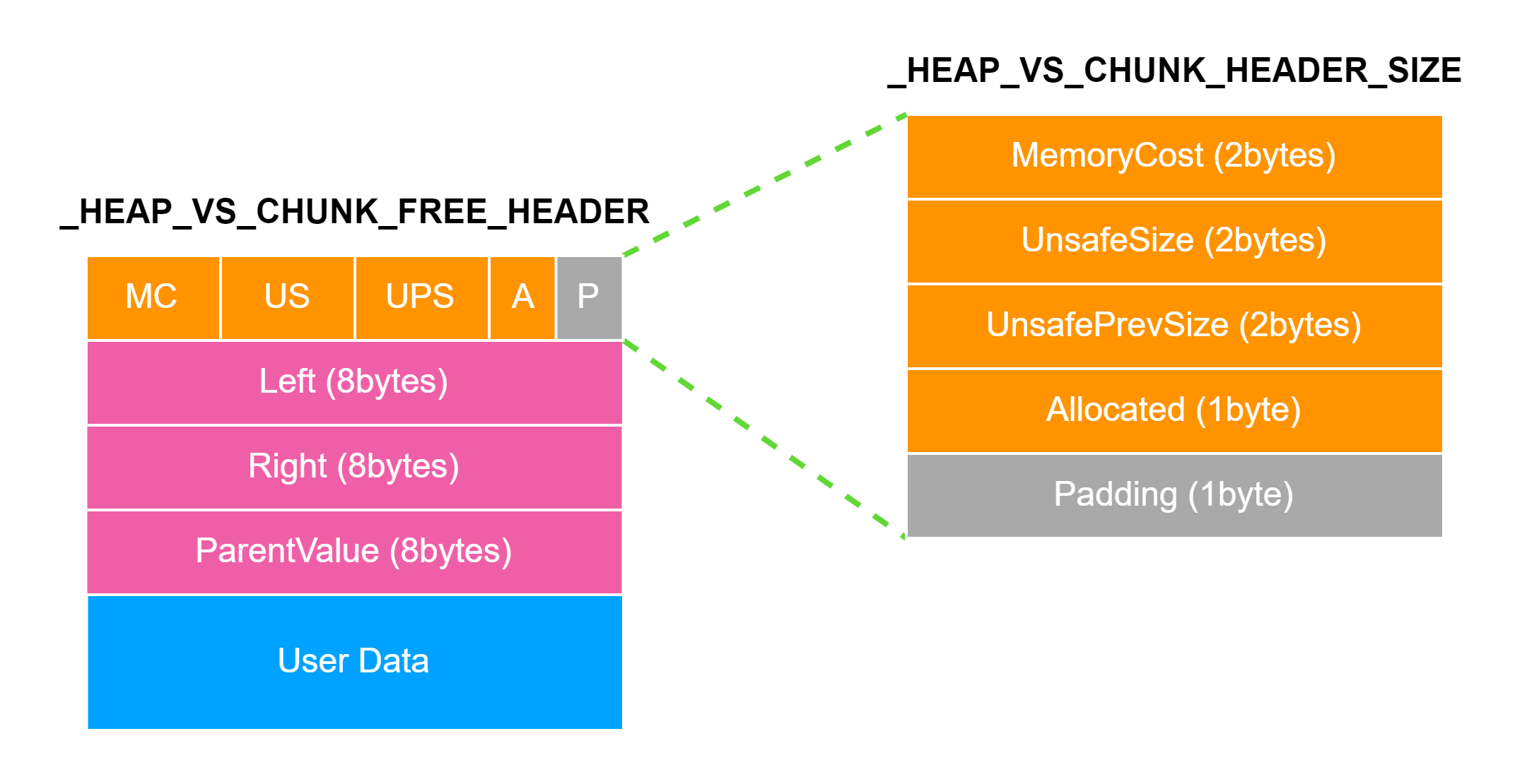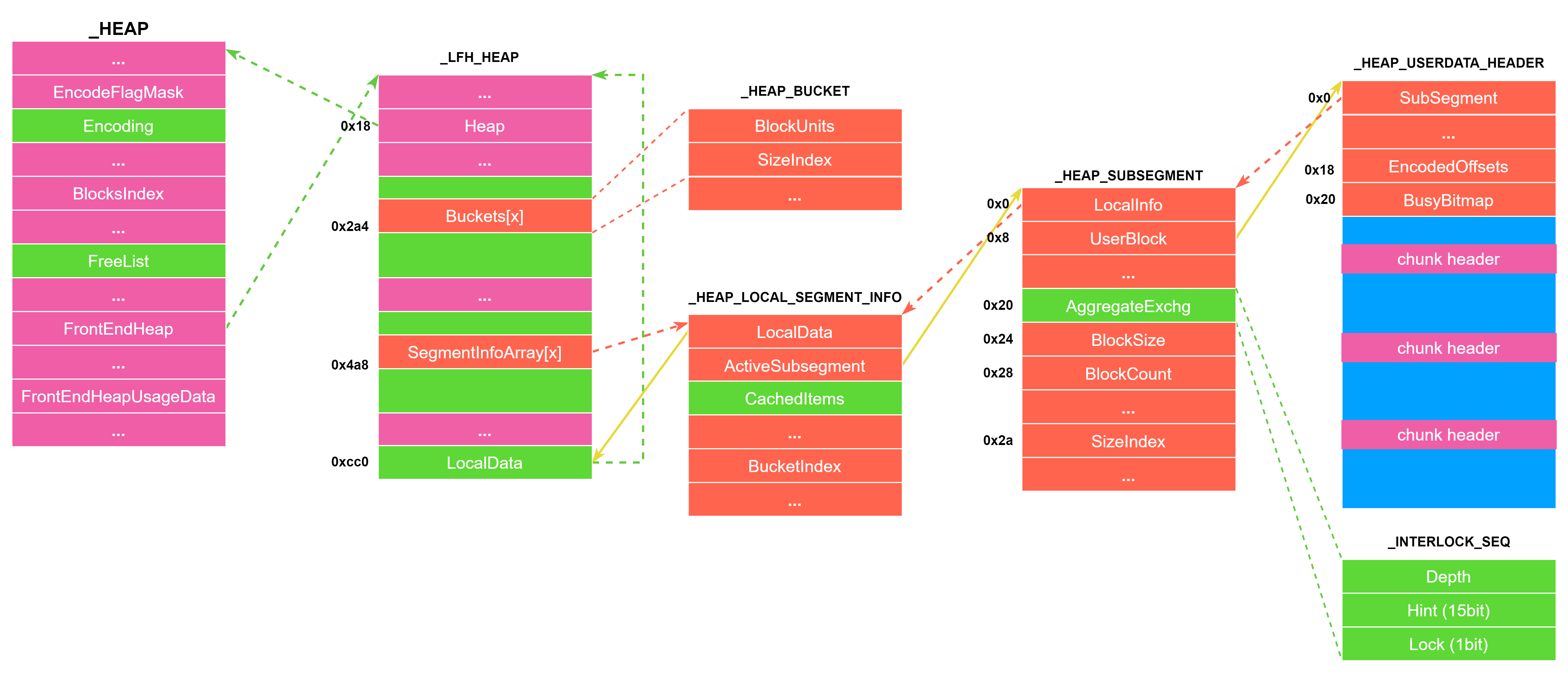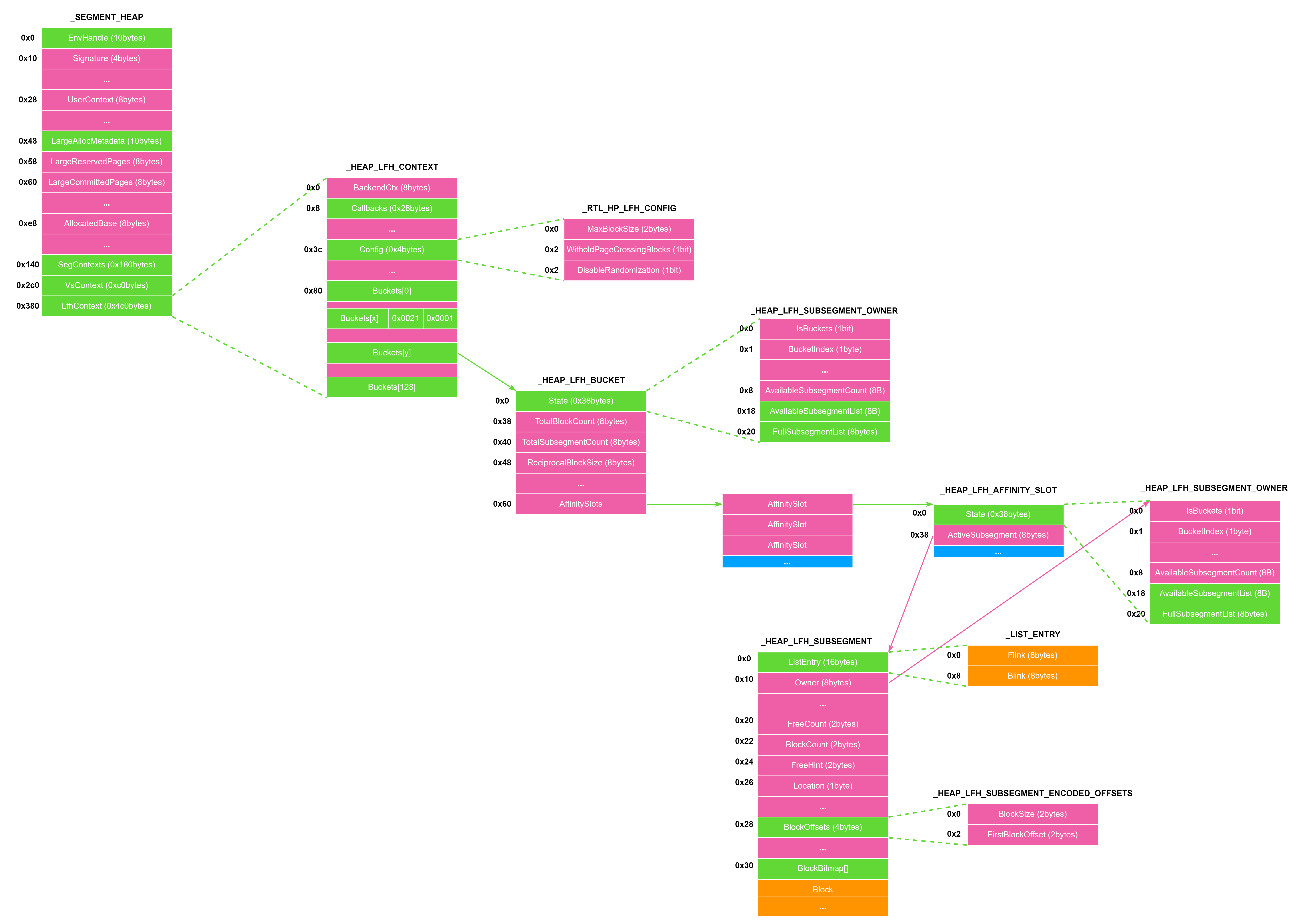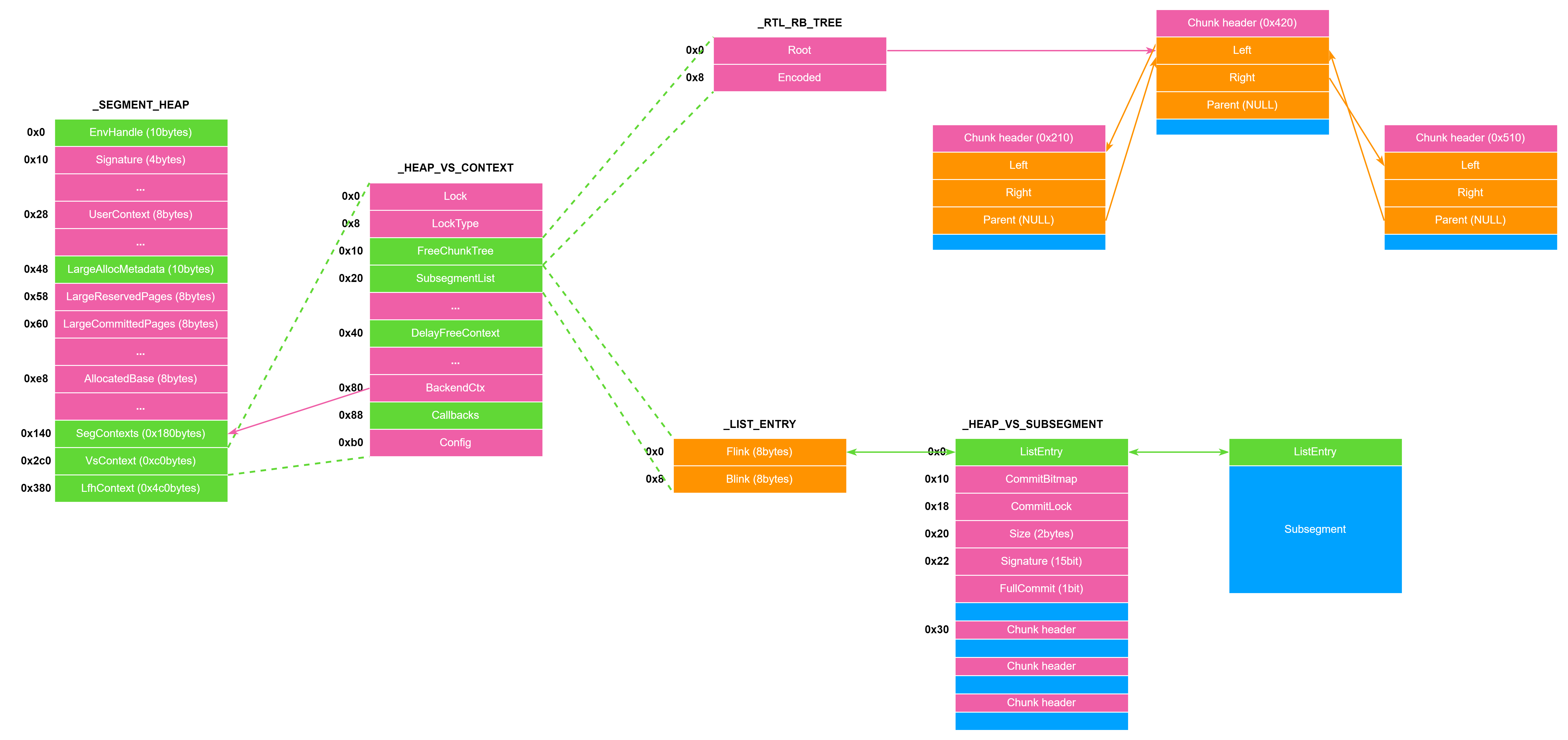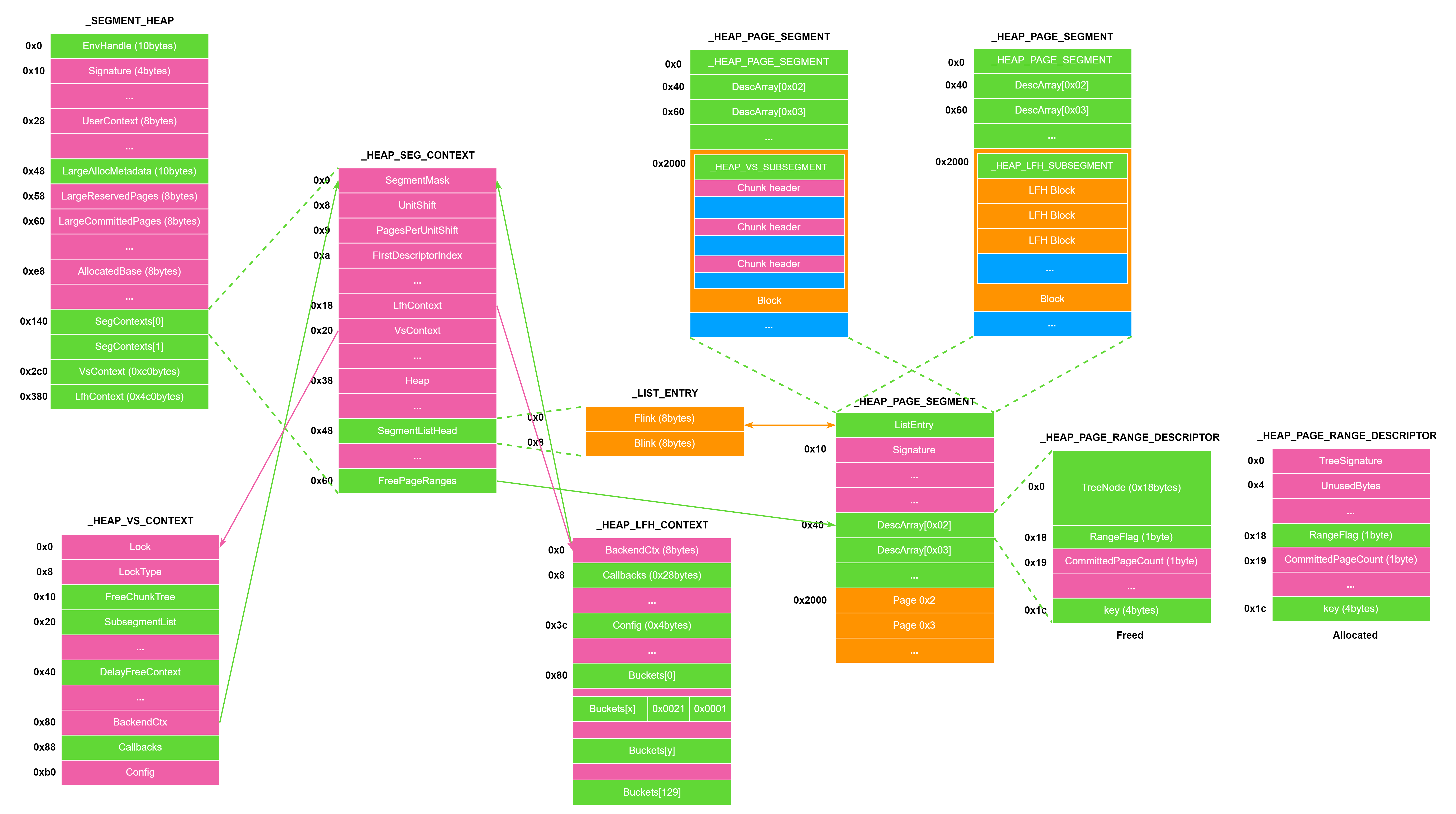 VirtualAddress:LargeBlock的地址,低 16 比特为UnusedBytes。AllocatedPages:分配的内存页数量。
