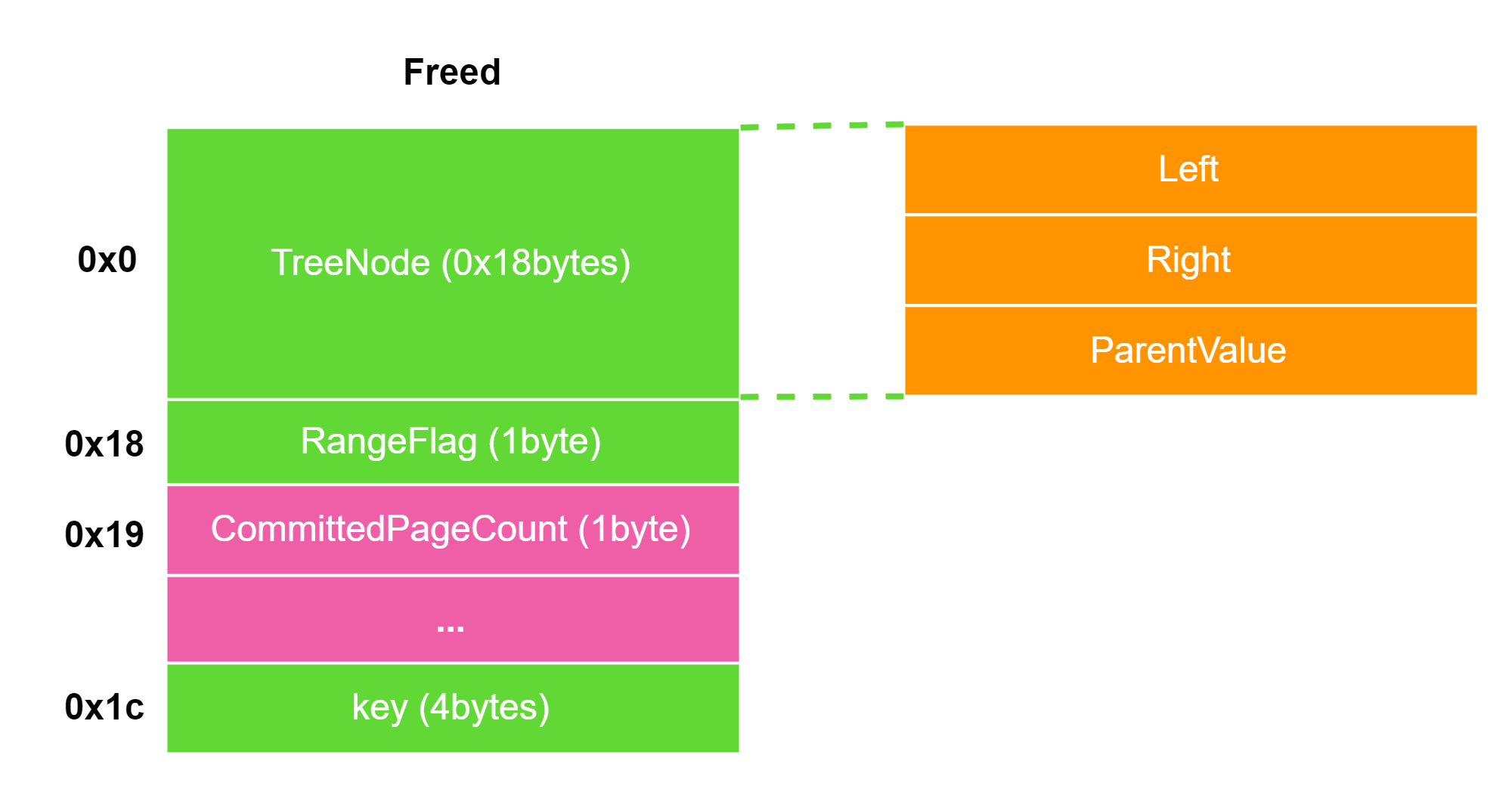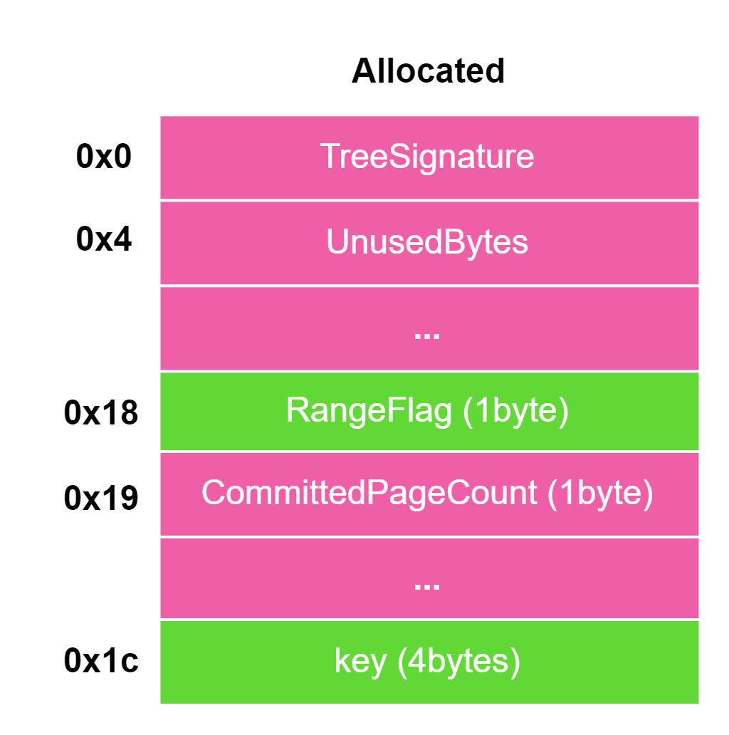 TreeNode (_RTL_BALANCED_NODE):Left:指向大小小于当前PageRangeDescriptor对应Block的Block对应的PageRangeDescriptor。Right:指向大小大于当前PageRangeDescriptor对应Block的Block对应的PageRangeDescriptor。ParentValue:指向父节点,指针最低 1 比特表示是否加密。