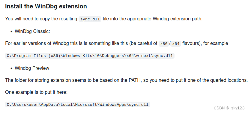 sync.dll和sync32.dll( 32 位文件夹下的sync.dll改名为sync32.dll),复制到C:\Users\username\AppData\Local\Microsoft\WindowsApps文件夹下(与 WinDbg 在同一目录)。旧版windbg插件安装,参考